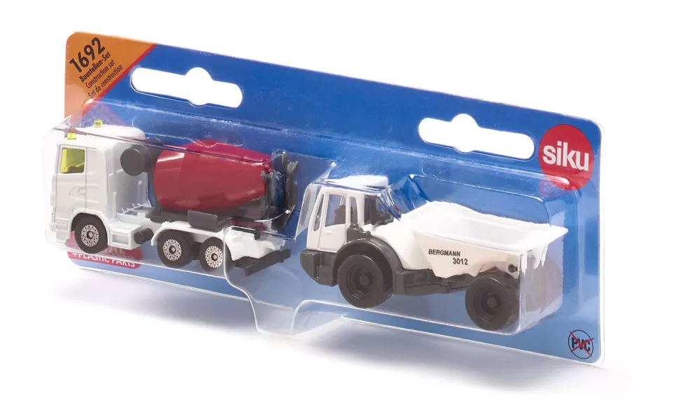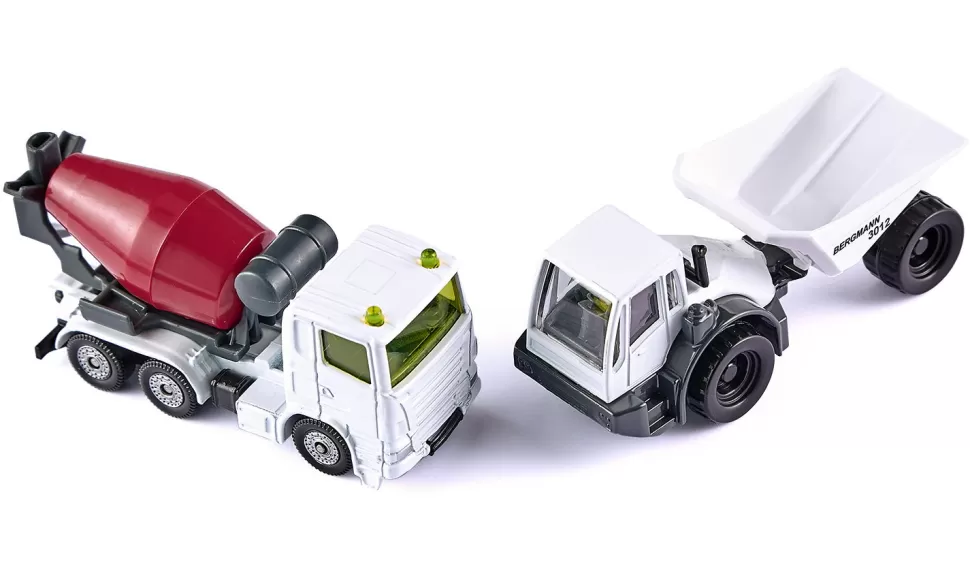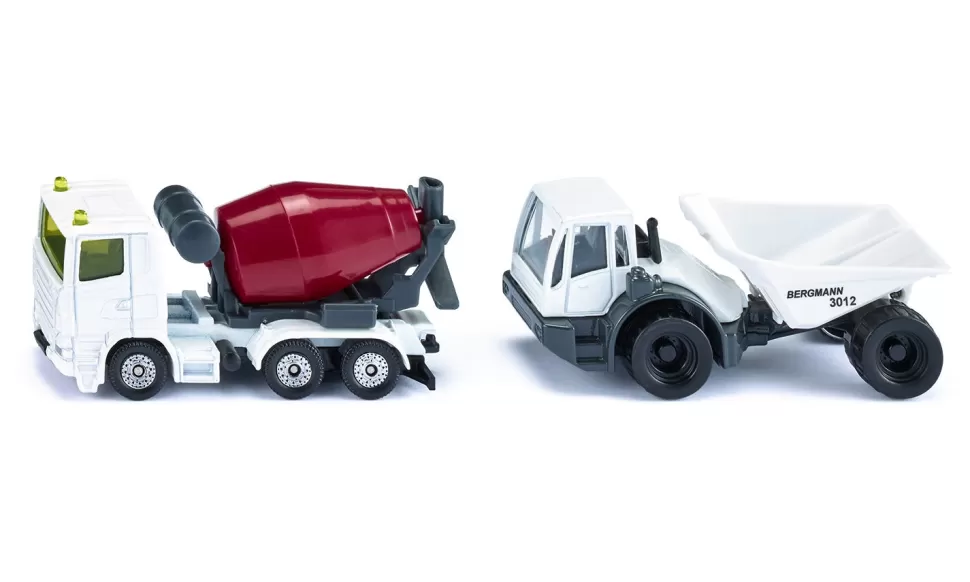 Auf zur BaugrubeAuf der Baustelle herrscht Hochbetrieb. Der siku Dumper kippt mit der großen Mulde Erde ab. Der Betonmischer mit der großen drehbaren Trommel steht schon in Abladeposition. Der siku Betonmischer ist mit dem Fahrerhaus und Fahrgestell aus Metall auch für harte Baustelleneinsätze geeignet.