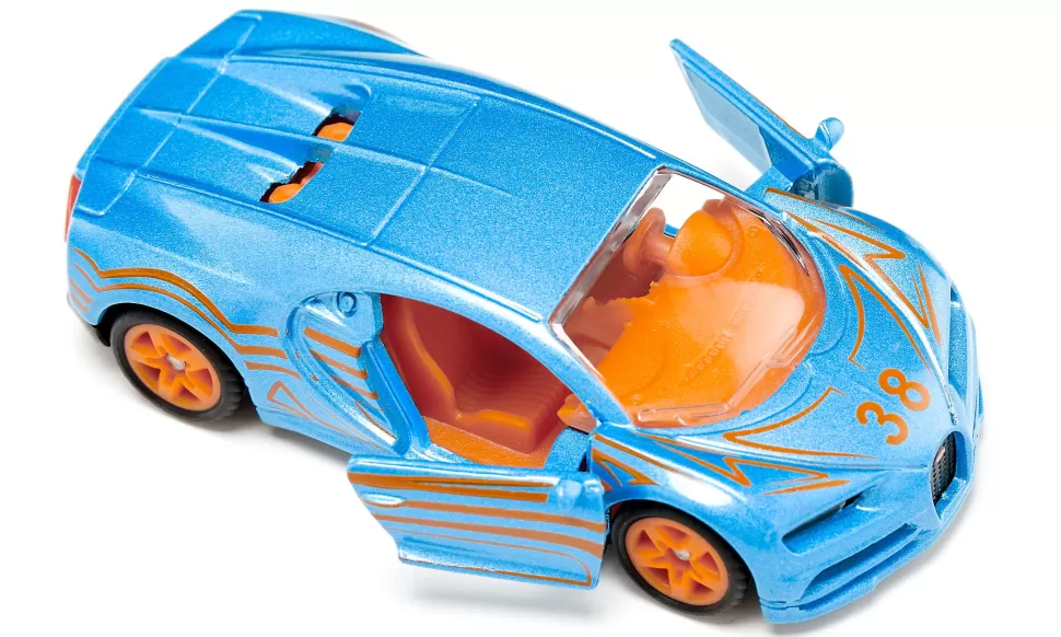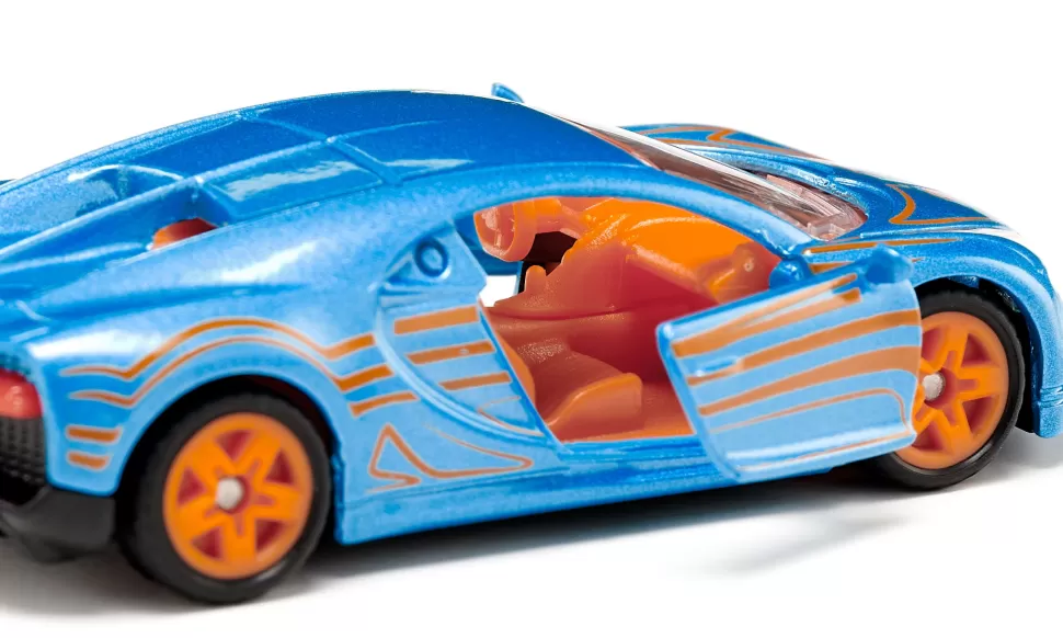 Es ist so breit, flach und muskulös, dass es schon im Stand wie ein wildes Tier aussieht, das nur darauf wartet, loszubrausen. Das siku Modell kommt in Electric-Blue mit orangefarbenem Innenraum und passenden Felgen auf gummierten Rädern, die das Auto noch cooler aussehen lassen. Und das Beste? Die Türen können geöffnet werden, um einen Blick auf die atemberaubende Innenausstattung zu werfen!