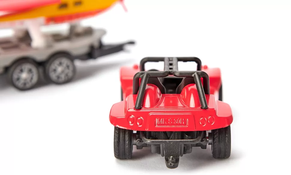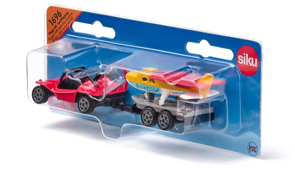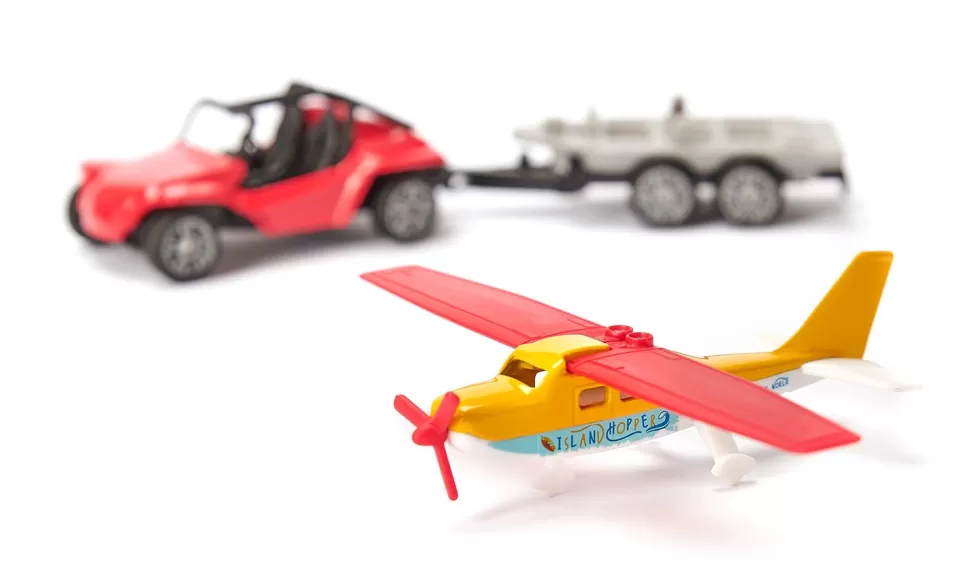 Bevor der Hobbypilot abheben und die Freiheit über den Wolken genießen kann, muss er sein Flugzeug erst mal an den geeigneten Startort bringen. Für den Weg zum Flugplatz ist das Gespann aus sportlichem Buggy mit Anhänger für Sportflugzeuge die perfekte Kombi. Der rote Buggy hat eine Metallkarosserie mit Überrollbügel sowie gummierte Reifen mit Sportfelgen. Der dazugehörige silberne Anhänger ist ein Tandem-Achser mit einer speziellen Halterung für Sportflugzeuge. Für den Transport können die roten Kunststoffflügel des mitgelieferten Flugzeugs eingeklappt werden. Der Aufdruck auf dem Metallrumpf ist auf beiden Seiten unterschiedlich, das gelbe Oberteil aus Kunststoff lässt das Flugzeug farbenfroh leuchten.