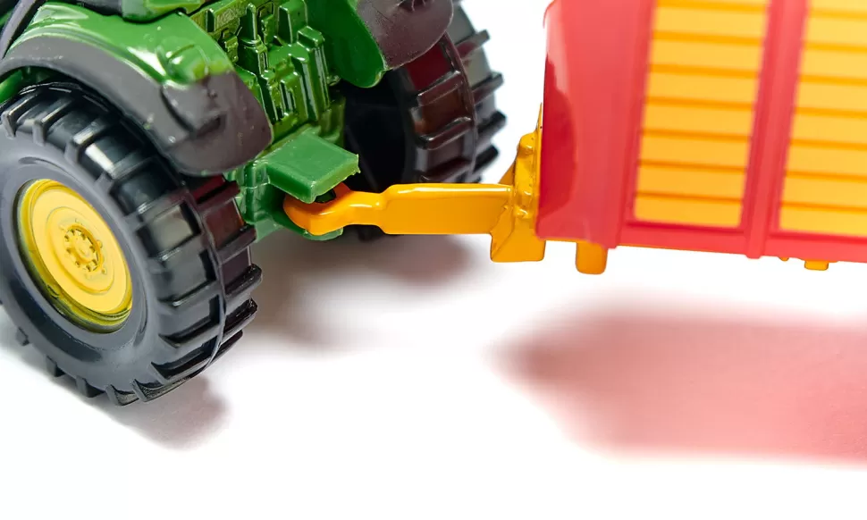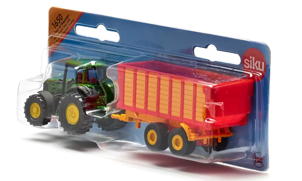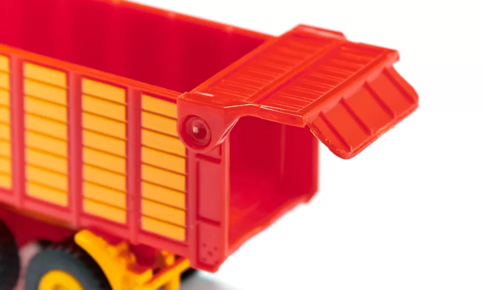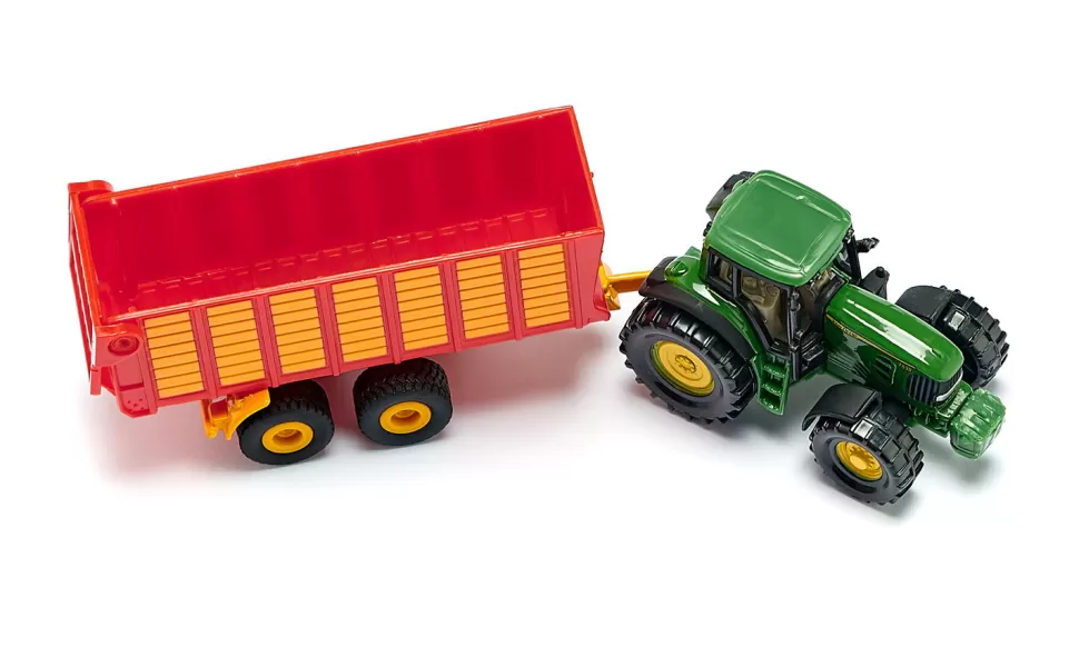 Bärenstarke Farmer-Kombination im kleinen Maßstab zum günstigen Preis. Der Silagewagen mit Tandem-Achs-Fahrwerk wird von einem wuchtigen Claas Traktor der neuesten Baureihe gezogen. Die Klappe am Heck der Mulde ist zum öffnen.