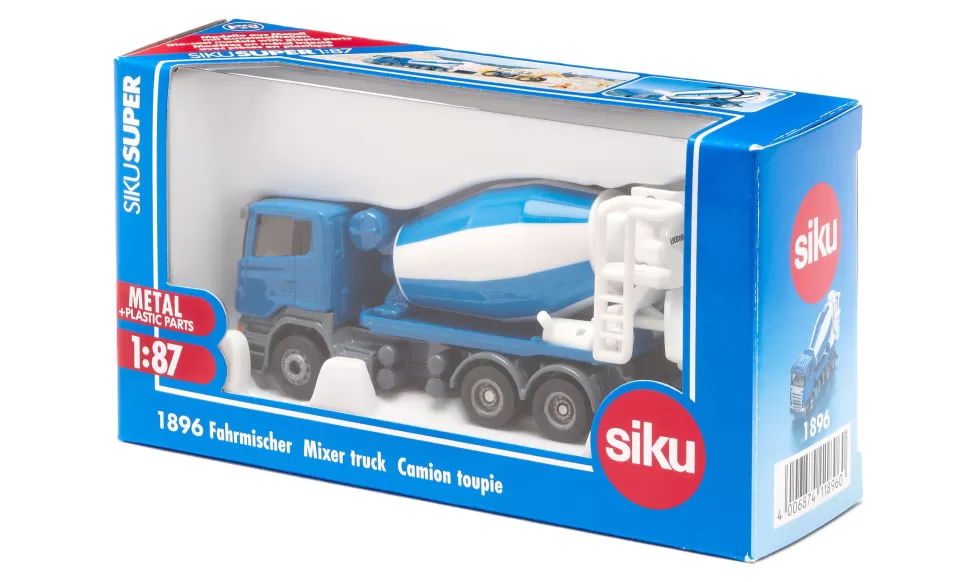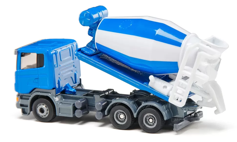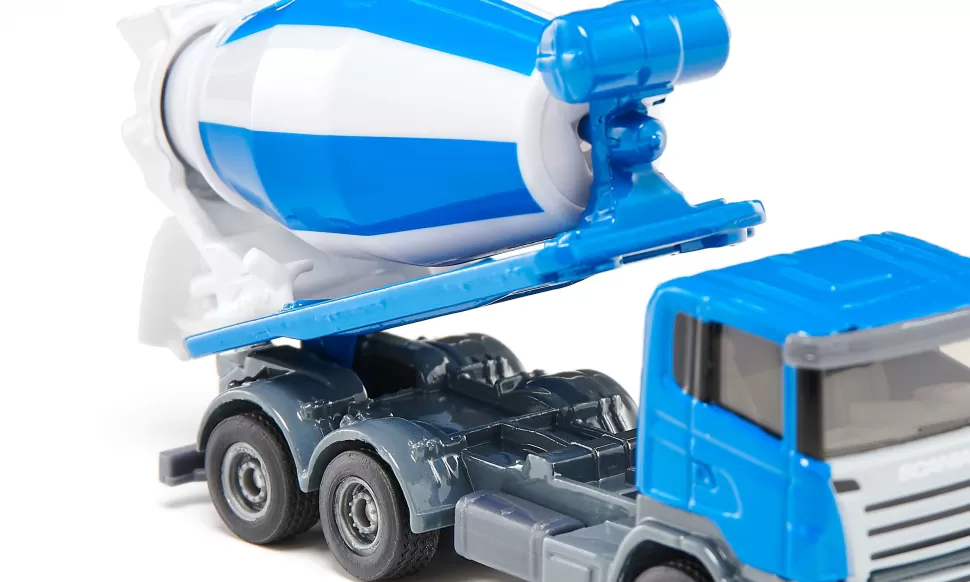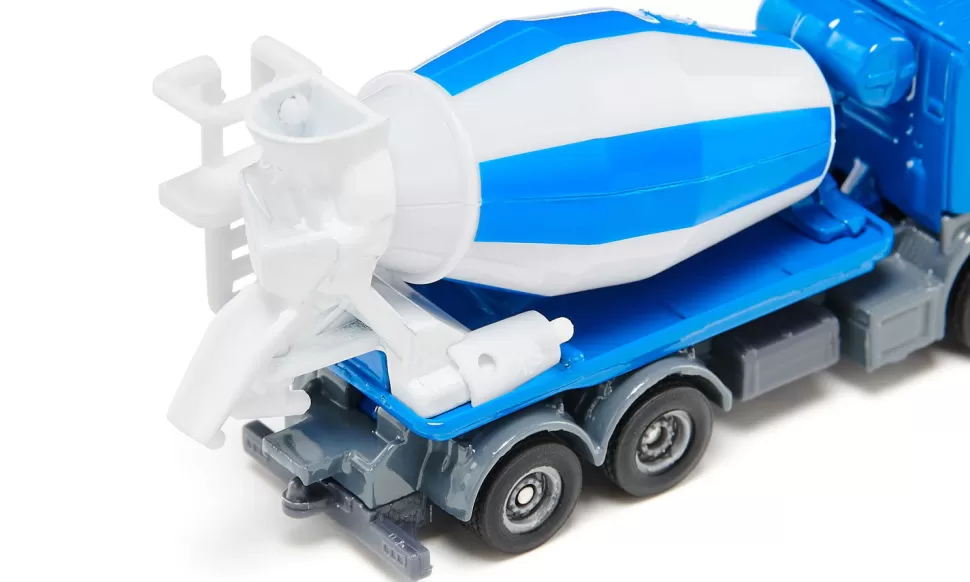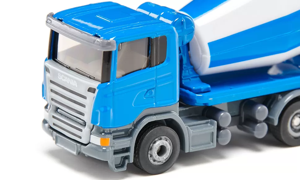 Transportbeton an die Baustelle zu bringen ist Aufgabe des Fahrmischers. Das 1:87 Modell mit Liebherr Aufbau auf einem 3-Achs-Fahrgestell mit verkehrsblauem Scania-Fahrerhaus wird dieser Aufgabe mühelos gerecht. Die Trommel ist drehbar und mit einem markanten Streifendesign bedruckt. Als zusätzliche Spielfunktion ist der Aufbau kippbar.