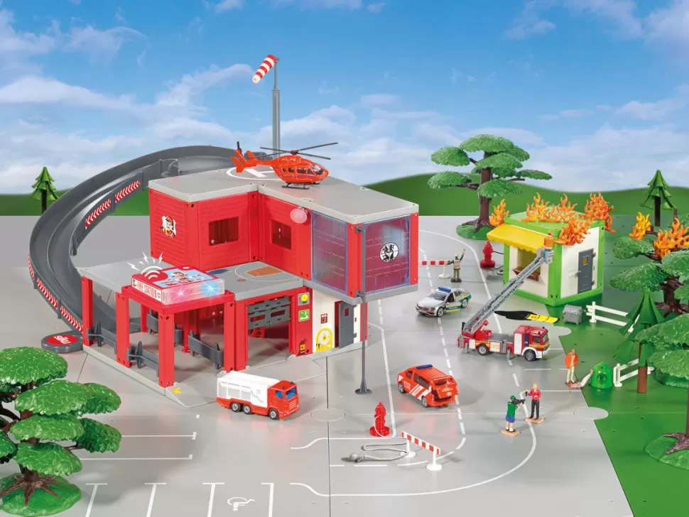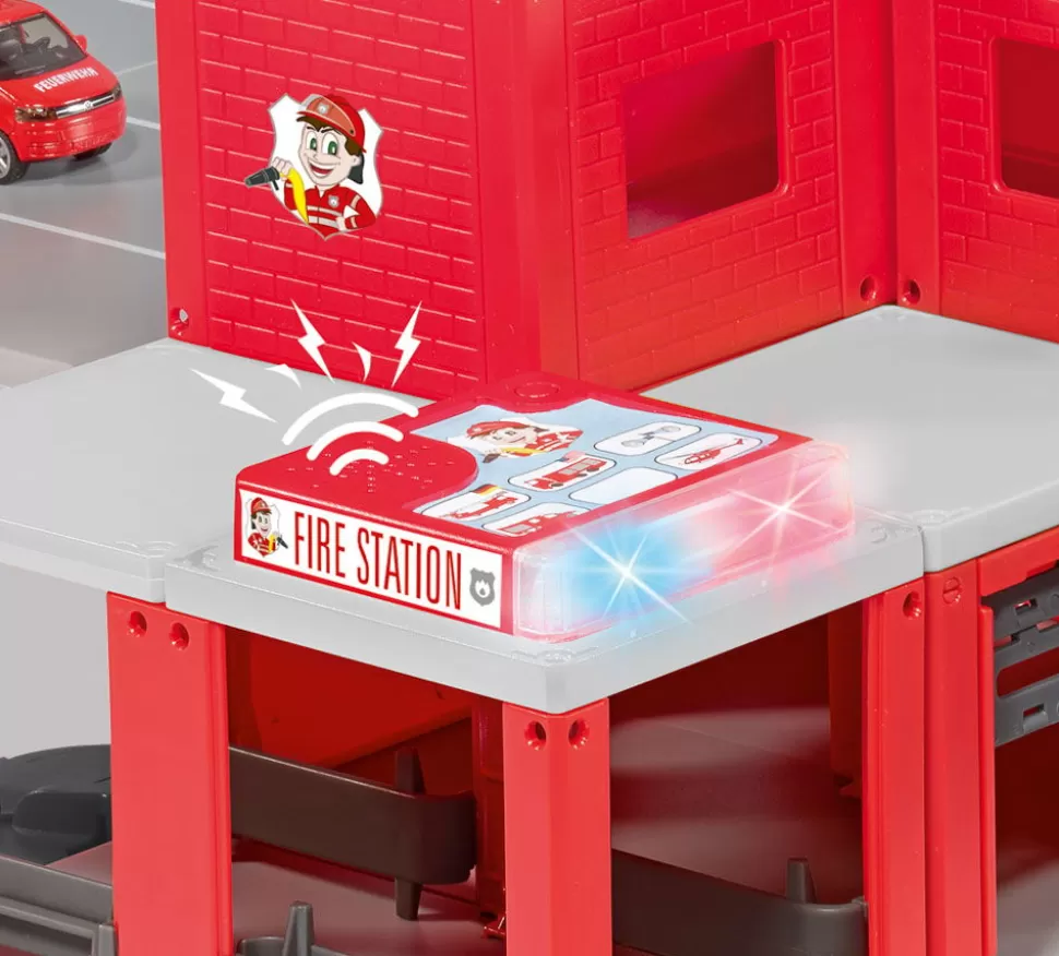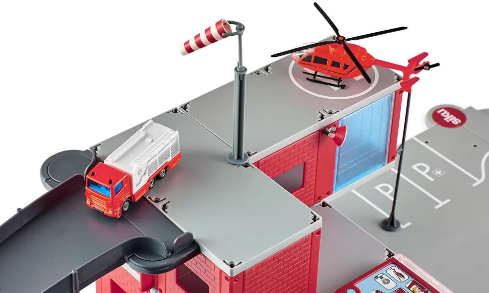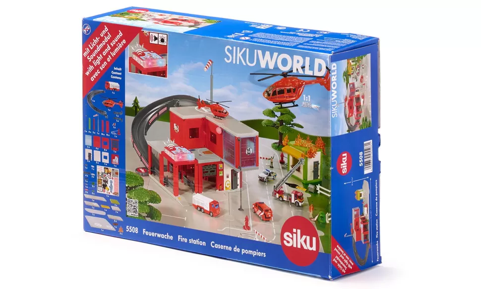 Einsatz an der Brandstelle! Notruf in der Leitzentrale der SIKUWORLD Feuerwache: es brennt! Die Feuerwehr ist sofort einsatzbereit, das Rolltor wird aufgeschoben und das Feuerwehrauto ist schon auf dem Weg. Tatütata: Mit dem integrierten Light & Sound-Modul mit blinkenden LEDs und sechs verschiedenen Sounds wird das Kinderzimmer zum Einsatzort. Angekommen: Aus dem Dach des kleinen Ladens in der Nachbarschaft schlagen schon die Flammen, gut, dass direkt daneben der Hydrant mit Schlauch und Spritze steht: Wasser marsch! Mit der neuen Feuerwache wächst die SIKUWORLD weiter. Das zweigeschossige Gebäude kann nach der anschaulich bebilderten Anleitung zusammengesteckt werden. Aus den Bauelementen entstehen auch ganz individuelle Gebäude in L- oder U-Form oder wachsen zu einem mehrgeschossigen Gebäude empor. Der modulare Aufbau und die Stabilität des Stecksystems setzen der Kreativität der Kinder keine Grenzen. Das siku Stecksystem fördert dabei spielerisch die motorischen und kognitiven Fähigkeiten des Kindes. Die Möglichkeit, ohne Hilfe von Erwachsenen etwas zu erschaffen, stärkt zudem das Selbstbewusstsein. Die Feuerwache ist kompatibel mit den anderen Sets der SIKUWORLD, ist aber auch allein bespielbar. Mit dem Hydranten mit Schlauch und Spritze, Rutschstange, Rolltor, Satellitenanlage und dem Windsack ist die Feuerwachse sehr detailliert ausgestattet. Viel Spielspaß versprechen der Hubschrauberlandeplatz auf dem Gebäudedach und die rasante Abfahrt. Enthalten sind bereits ein Feuerwehrfahrzeug und der Feuerwehrhubschrauber. Natürlich lässt sich die SIKUWORLD mit den vielen siku Feuerwehrfahrzeugen bespielen. Aufbauzeit: 32 Minuten