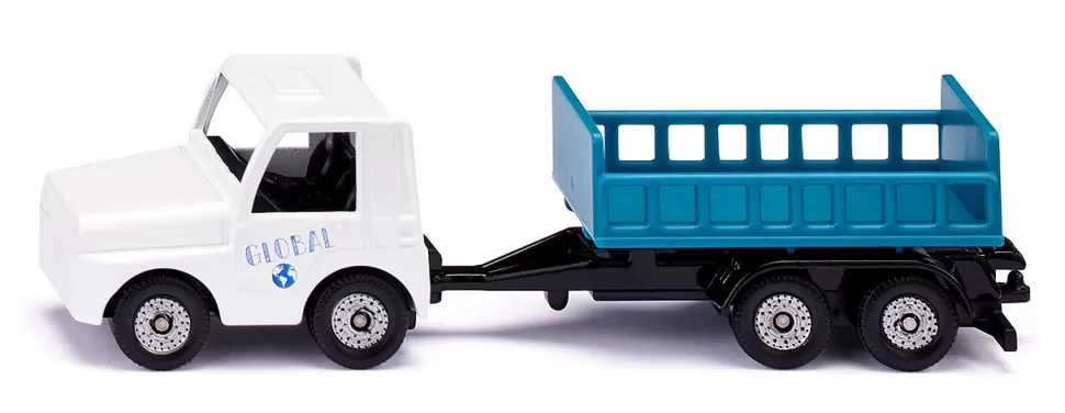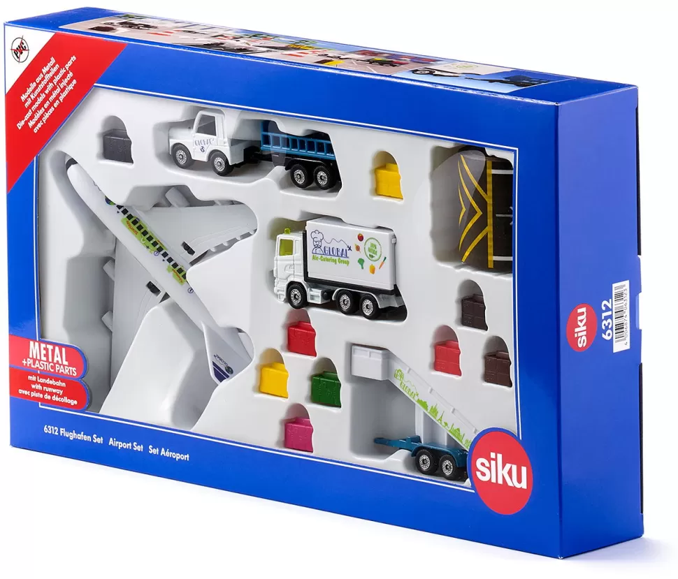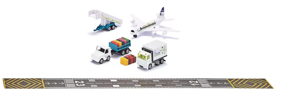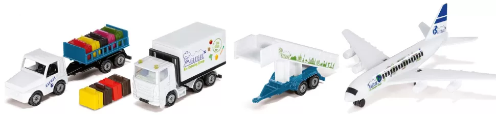 Der Flughafen ist für kleine und große Fluggäste faszinierend. Ständig ankommende und abfliegende Flugzeuge, dazwischen umherfahrende Schlepper und Laster. Das neue siku Flughafen Set besteht aus einem vierstrahligen Verkehrsflugzeug, einem Catering-Fahrzeug für die Bordverpflegung, einem Anhänger mit Fluggasttreppe, einem Flughafenschlepper und einem Kofferanhänger. Dank öffenbarer Front- und Heckklappe wird das Be- und Entladen der Koffer zum Kinderspiel. Der Kofferaufbau des Catering-Fahrzeugs lässt sich mit einer Scherengittermechanik in der Höhe verstellen. An den Flughafenschlepper lässt sich nicht nur der Kofferwagen, sondern auch die Fluggasttreppe aus Metall und Kunststoff anhängen. Doch wo starten und landen die Flugzeuge? Im Set ist eine fünf Meter lange Rolle selbstklebendes Tape, bedruckt mit typischen Markierungen, enthalten. Diese kann einfach mit der Schere abgeschnitten werden und haftet auf glatten Bodenbelägen und kurzflorigen Teppichböden. Das Flughafen Set ist die ideale Ergänzung zum neuen SIKUWORLD Verkehrsflugzeug (Artikelnummer 5402).