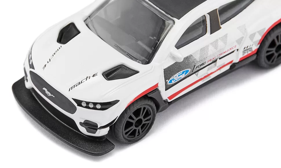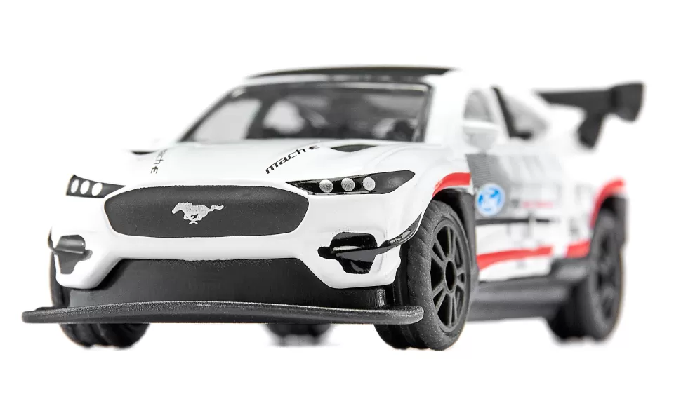Meine Damen und Herren, Sie sehen hier ein absolutes Meisterstück der Automobilsport-Evolution: Der Ford Mustang Mach-E 1400. Kaum zu glauben, dass dieser schnittige Rennwagen mit dem riesigen Heckflügel und seinen satten 1.500 PS unter der Haube ein Elektrofahrzeug ist! 3, 2, 1, GO! Der E-Mustang schießt mühelos auf Höchstgeschwindigkeit und hat die Konkurrenz im Nu abgehängt. Sportliche Felgen mit gummierten Reifen bieten auch in engen Kurven optimalen Grip. Die Metall-Karosserie des Rennwagens besticht zudem mit hammer-coolem Racing-Design und aufwendiger Bedruckung: strahlend weiß mit mehrfarbigen Farb- und Logo-Akzenten – dazu noch die biestig aussehenden, schwarzen Felgen… Ein Traum für alle Fans der legendären Amerikaner. Das detailgetreue Abbild des Original-Rennwagens ist übrigens ein Einzelstück.