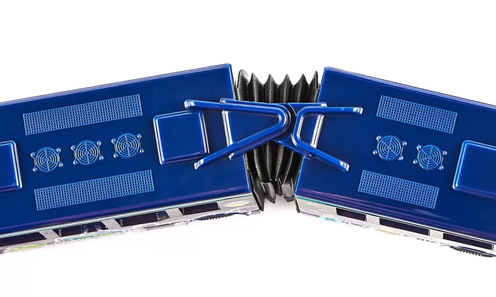 Der Gelenkbus aus Metall- und Kunststoffteilen spiegelt das Aussehen des echten Fahrzeugs wider. Dank der Gummireifen und des Mittelgelenks lässt sich der Bus frei drehen. Ein perfektes Spielzeug für kleine Fahrer.