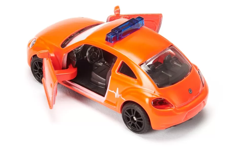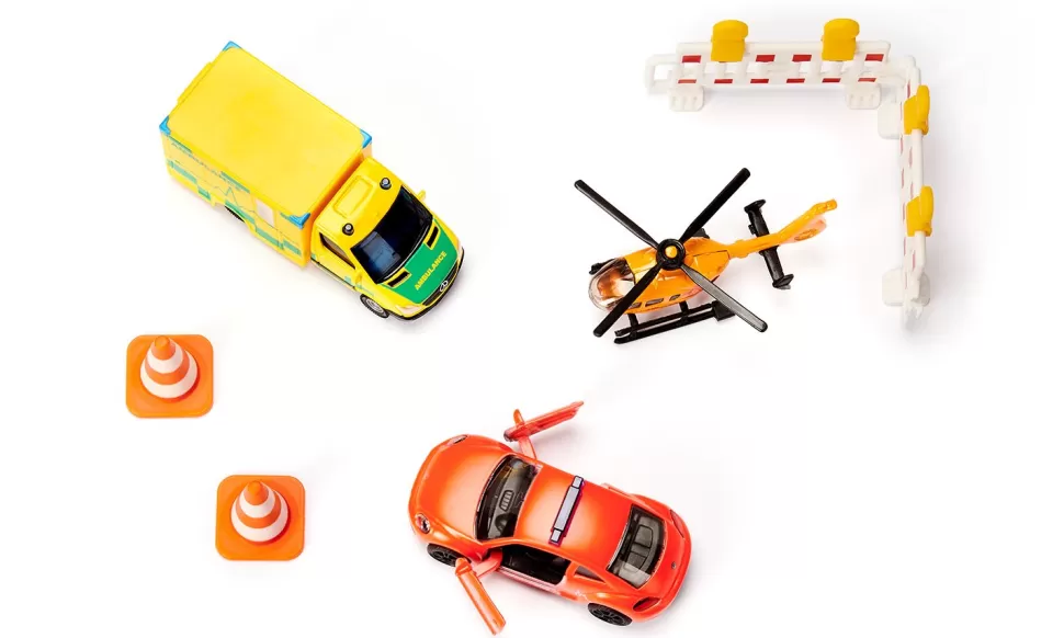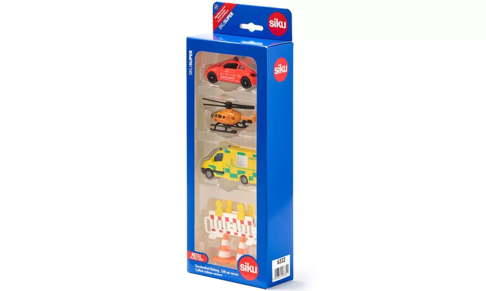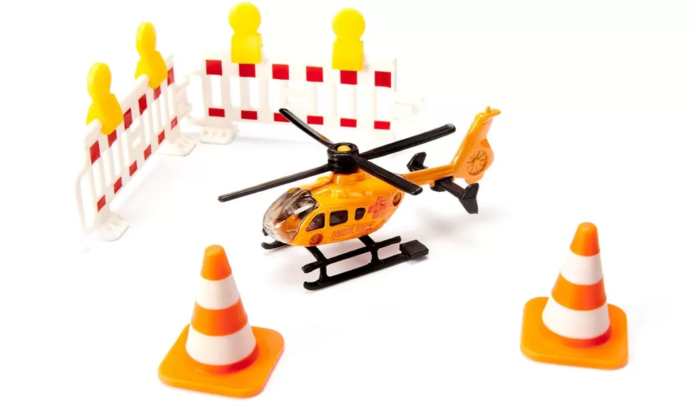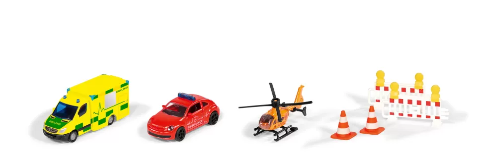 In einer Notfallsituation zählt jede Sekunde. Deshalb ist es wichtig, dass die Rettungskräfte schnell vor Ort sind. Ob auf der Straße oder aus der Luft – mit dem Rettungsset von siku naht schnelle Hilfe, denn die Lebensretter sind schon auf dem Weg! Das Set besteht aus drei Fahrzeugmodellen und diversen Zubehörteilen. Als Notarztwagen fungiert ein VW Beetle mit internationaler Bedruckung „Ambulance“, roter Einsatzlackierung und Blaulichtbalken auf dem Dach. Die Türen des Fahrzeugs lassen sich öffnen. Zu Hilfe eilt ihm als Rettungswagen ein leuchtend-gelber Mercedes Sprinter mit aufwändiger und mehrfarbiger Signalbedruckung und grünem „Ambulance“-Schriftzug auf den Seitenflächen. Zur Luftunterstützung kommt außerdem noch ein Helikopter zum Einsatz. Seine Rotorblätter sind klappbar und der Propeller lässt sich drehen. Zur Absicherung der Unfallstelle enthält das Set zudem zwei Warnbaken sowie zwei orange-weiße Pylonen.
