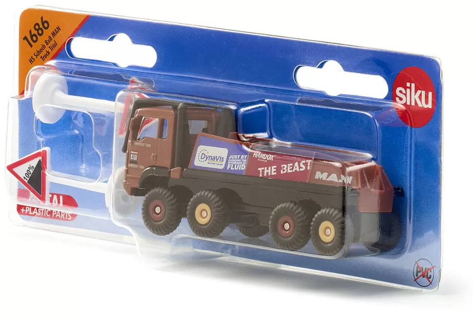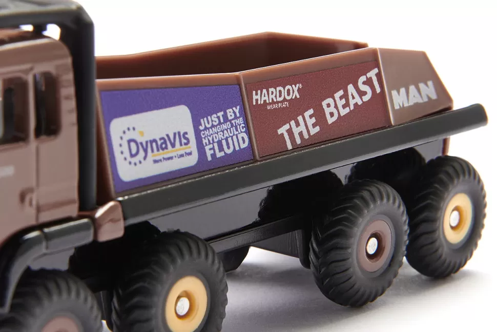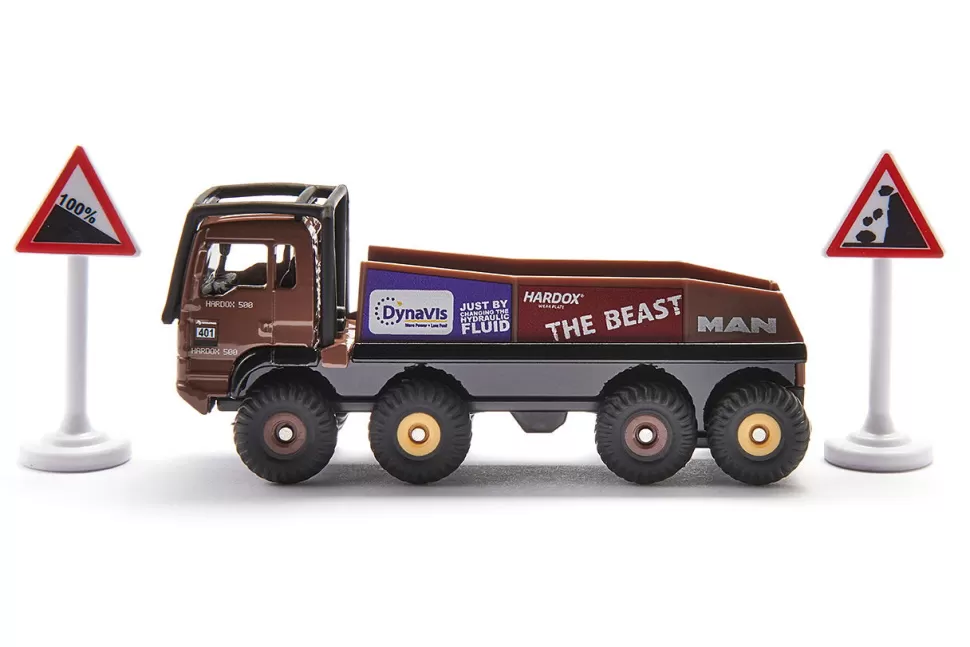 Die Anfahrt ist extrem steil. Die grobstolligen Reifen finden trotz Geländeuntersetzung und Allradantrieb an vier Achsen kaum Halt. Geschafft, nun gilt es den Steinbrocken zu überfahren. Was für einen LKW-Fahrer unvorstellbar ist, ist im Truck-Trial die besondere Herausforderung und der Nervenkitzel für Fahrer und Zuschauer. Der HS Schoch 8×8 MAN Truck-Trial ist für extreme Geländeeinsätze im Wettbewerb entwickelt und konstruiert. Das Fahrzeug des achtmaligen Europameisters im Truck-Trial ist mit den originalen Sponsorenaufklebern beklebt und mit dem außenliegenden Überollbügel ausgestattet. Mit den beiden in der Verpackung enthaltenenSchildern lässt sich das Kinderzimmer zu einem Trial-Parcours verwandeln.