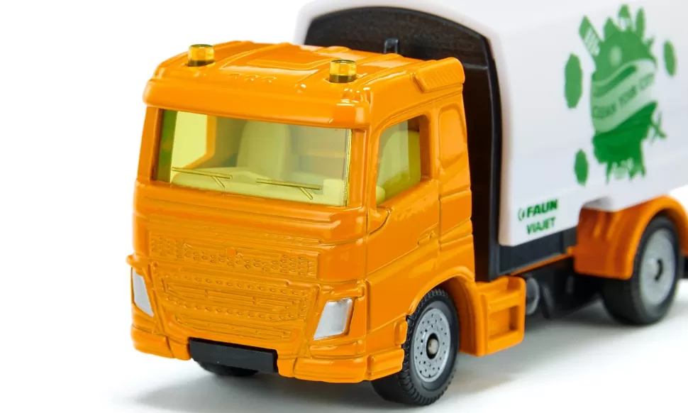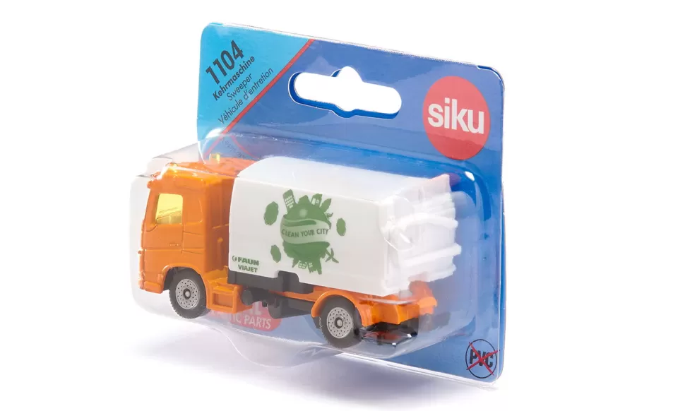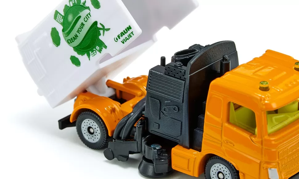 Egal ob Fußgängerzone oder Wohngebiet – die Kehrmaschine von Faun Umwelttechnik sorgt für Sauberkeit in der ganzen Stadt! Dank Leichtlaufrädern und zweiachsigem Fahrgestell aus Kunststoff ist sie besonders wendig und kommt auf allen Straßen und Plätzen zurecht. Mit einem Metall-Fahrerhaus sowie Kehrmaschinen-Aufbau und Saugeinrichtung aus Kunststoff ist sie bestens ausgestattet, um jedem noch so schmutzigen Reinigungsjob gerecht zu werden. Der Schmutzsammelbehälter lässt sich zum Entleeren hochklappen. Durch ihr leuchtend-oranges Fahrerhaus ist die Kehrmaschine schon von weitem sichtbar. Auf dem Sammelbehälter prangt in Grün der Aufdruck „Clean your City“.