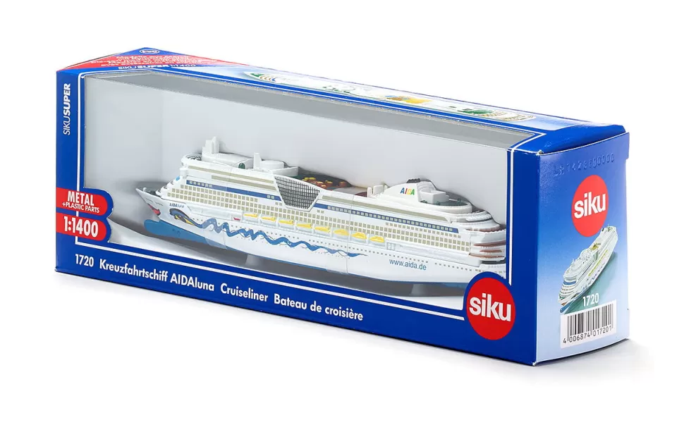Durch den im SIKU-Sortiment aussergewöhnlichen Maßstab 1:1400 wird die über 250 Meter lange AIDALuna auf ein handliche und kindgerechte Größe reduziert. Das mit Metallrumpf und einem Aufbau aus Kunststoff ausgestattete Modell ist sehr detailliert gearbeitet und besticht durch die AIDA-typische farbenfrohe Lackierung mit dem unverwechselbaren Kussmund. Das Modell ist NICHT schwimmfähig.