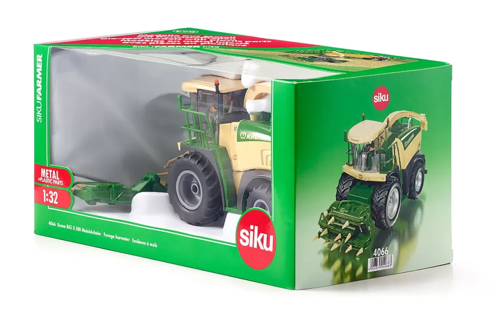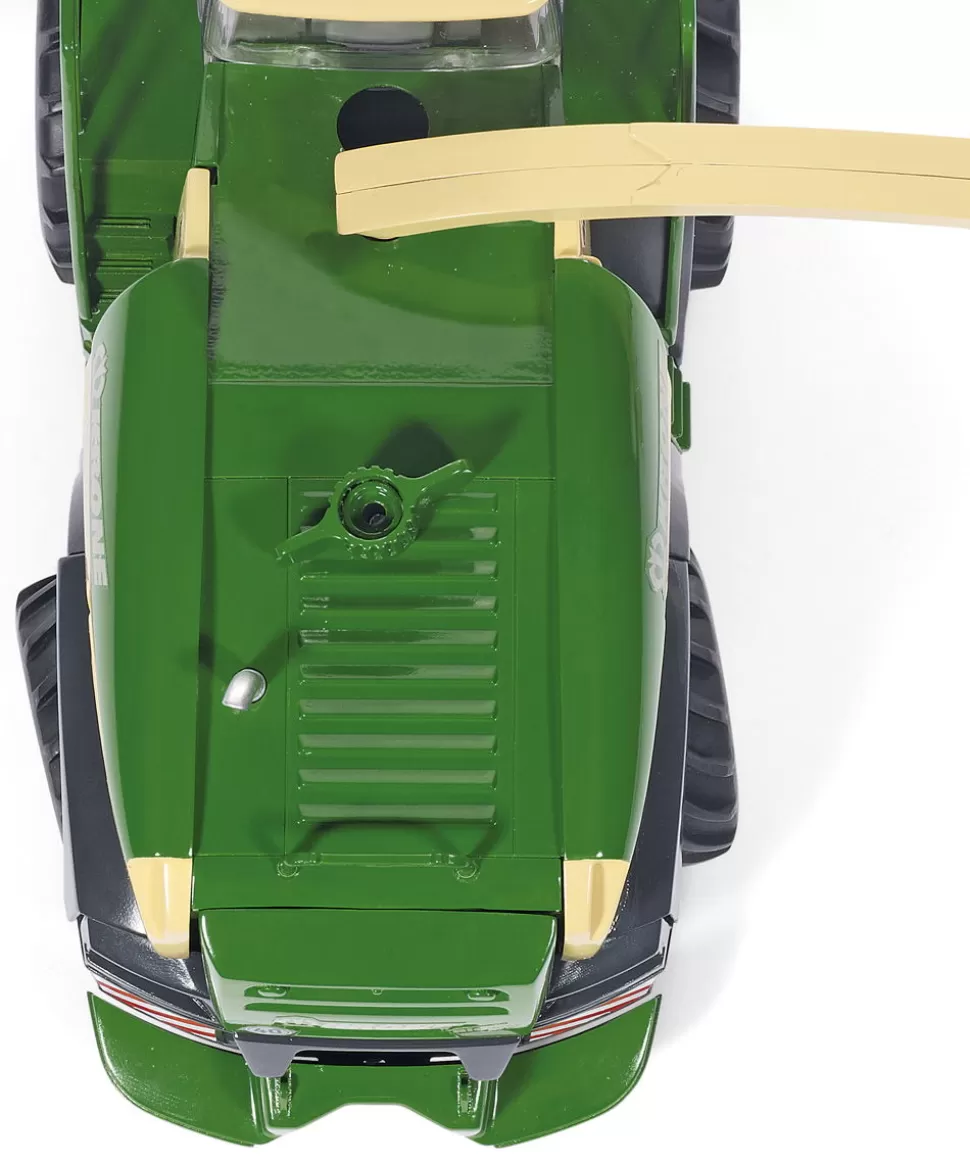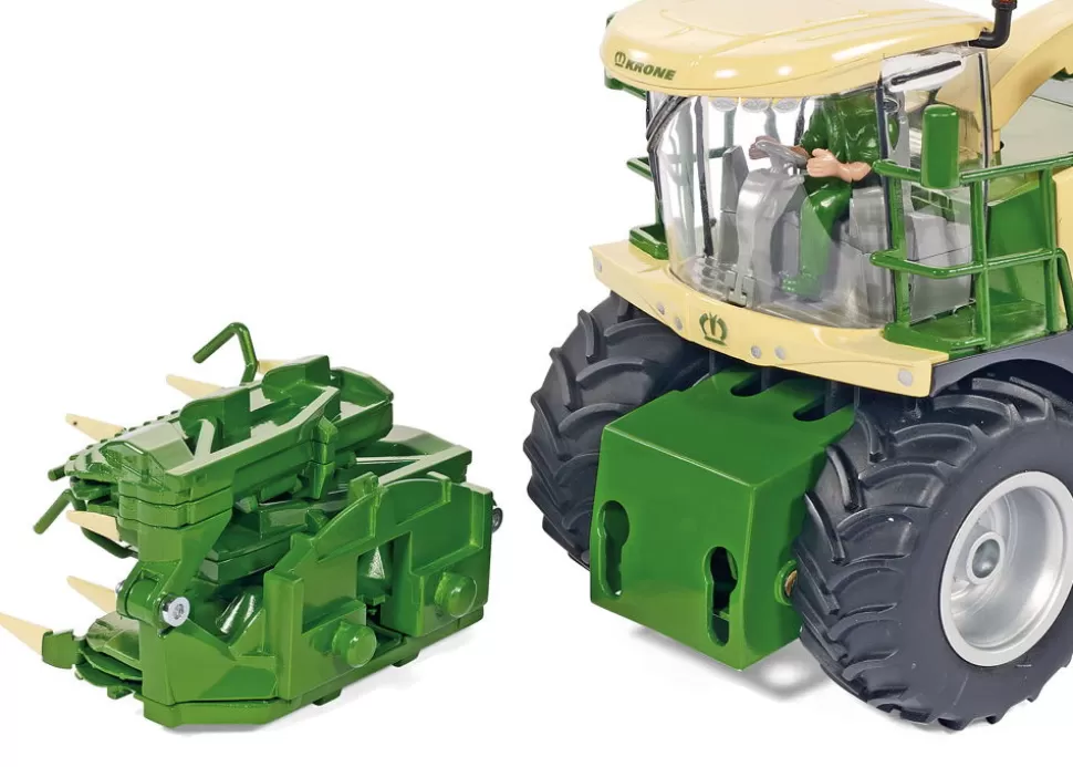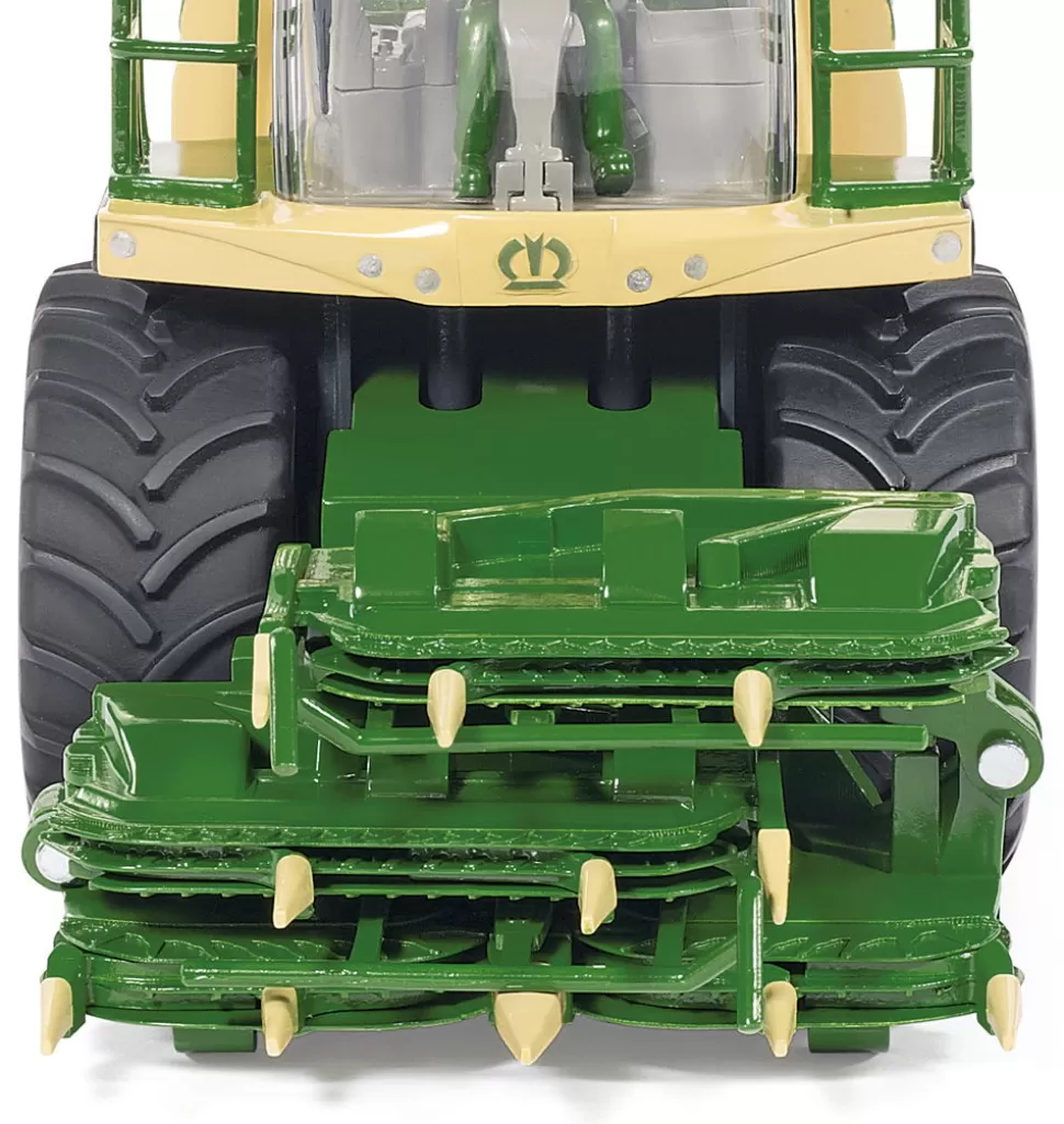 Eine Leistung von 580 PS und vielfältige Funktionen machen diesen neuen und kompakten Häcksler von Krone zu einer schlagkräftigen Maschine auf dem Kinderzimmer-Bauernhof. Mit der SIKU-typischen Lenkung lässt sich die Maschine präzise und spurgenau führen. Die drei Motorenklappen lassen sich öffnen und geben den Blick auf den gewaltigen Motor frei. Ein besonderer Clou ist die detaillierte Darstellung des Faltmechanismus vom Maisgebiss. Dieses faltet sich platzsparend zweifach übereinander, nachdem der Reihentaster und die „Gitter“ nach oben geklappt wurden. Ein drehbares Auswurfrohr vervollständigt dieses originalgetreu dargestellte Modell.