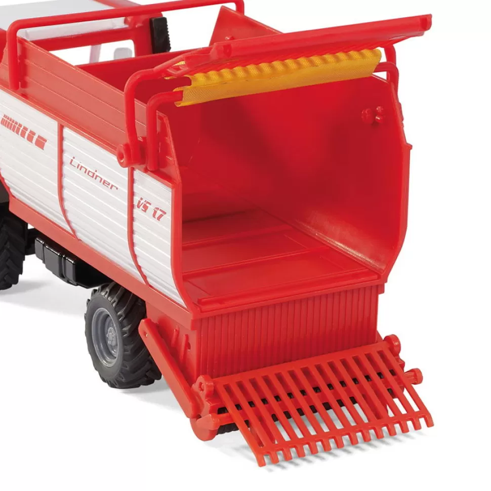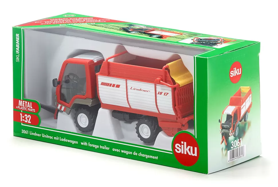 Die Arbeit an Berghängen, hoch gelegenen Weiden und in schmalen Tälern ist die Hauptaufgabe dieses Multifunktionsfahrzeugs, das im landwirtschaftlichen Maßstab 32-fach verkleinert das SIKU-Farmer Sortiment ergänzt. Der Unitrac ist mit einem Gelenk mit Niveauausgleich versehen, welches in unebenem Gelände das Fahrzeug in der Spur hält. Die mit klappbaren Spiegeln ausgestattete Kabine kann seitlich geklappt werden und gibt den Blick auf den detailreich gestalteten Motor frei. Das Kabinendach ist abnehmbar, so dass SIKU-Fahrerfiguren in das Modell gesetzt werden können. Am Ladewagen, der mit einem durch Gravuren angedeuteten Kratzboden aufwartet, wird detailreich die Ladefunktion dargestellt. Mit der Anhängevorrichtung an der Front des Modells lassen sich die verfügbaren SIKU-Frontgeräte auch mit diesem Fahrzeug nutzen.