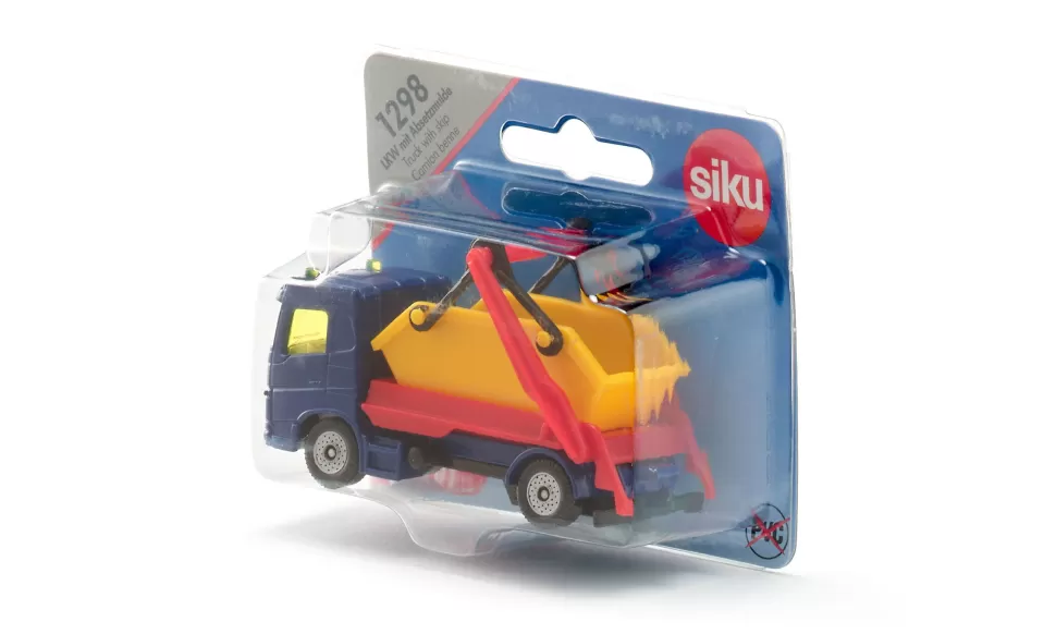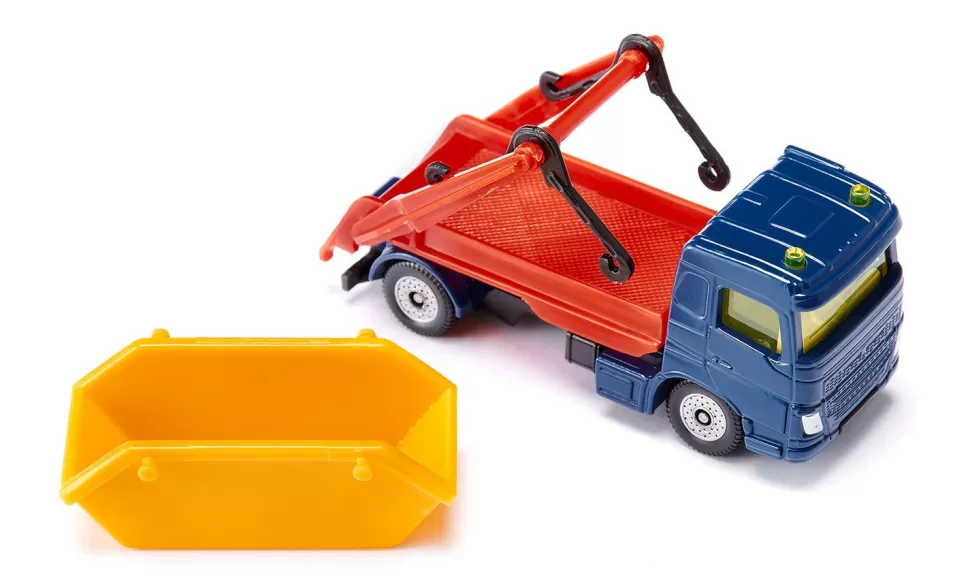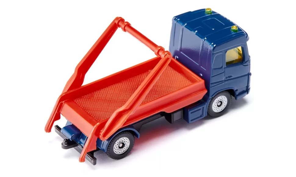 Die gelbe Kunststoff-Mulde wird übrigens, ganz wie im echten Leben, mit einer speziellen Absetzeinrichtung mit beweglichen Kran-Armen angehoben und abgesenkt. Dank seiner Anhängerkupplung ist der LKW zudem mit Anhängermodellen anderer siku-Serien kompatibel.