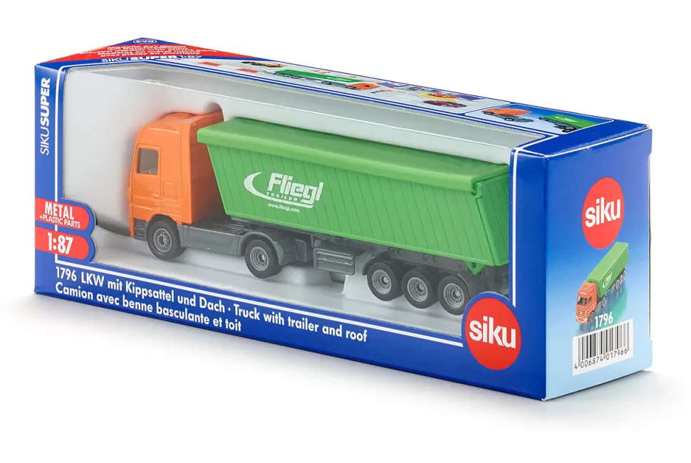 Nach den neuesten Sicherheitsvorschriften sind Schüttgüter auf LKW nur noch mit einer Plane zu fahren. SIKU setzt diese aktuelle Vorschrift auch für den Spielbetrieb um. Die Mercedes-Benz Actros Zugmaschine zieht einen 3-achsigen Kippsattel-Auflieger mit beweglicher Mulde und abnehmbarer Dachplane aus flexiblem Kunststoffmaterial. Die Heckklappe der Mulde ist beweglich. Diese kann sowohl mit als auch ohne Dachplane geöffnet werden.