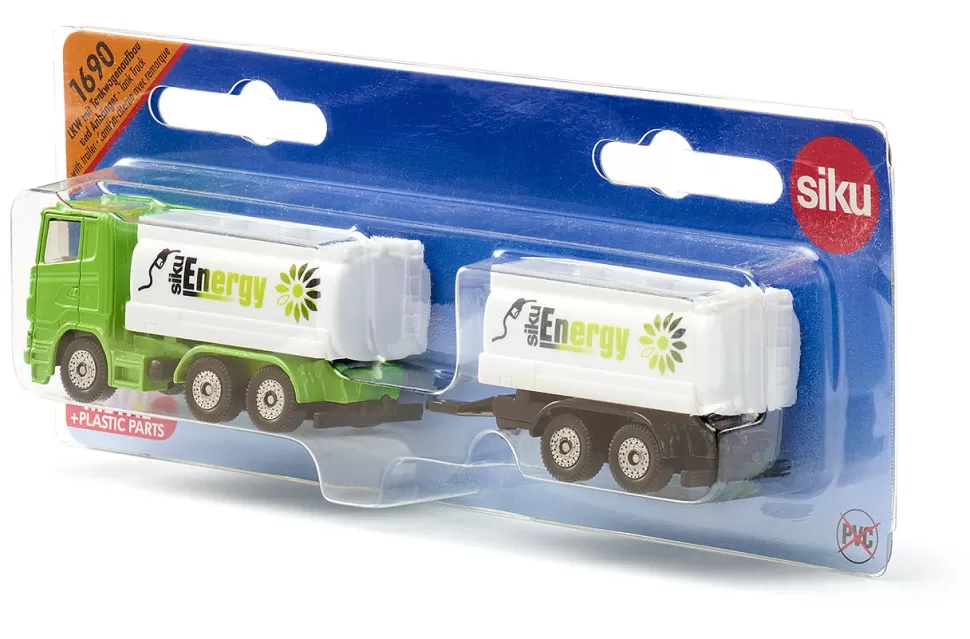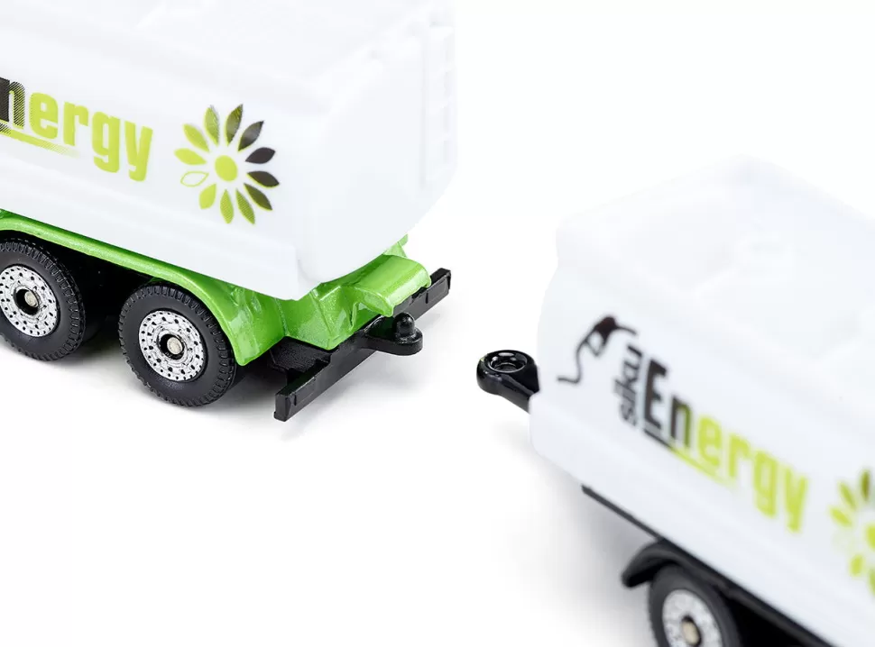Wenn die Tankanzeige im roten Bereich ist, wird es höchste Zeit für die SIKU Autos, Lastwagen, Traktoren und Busse, den nächsten Tankstopp an der SIKUWORLD Tankstelle einzulegen. Die Tankstelle wird vom neuen SIKU energy Tanklastzug versorgt: ein Dreiachs-Tankwagen mit leuchtend grünem Fahrerhaus und einem Tandemanhänger mit einem Tankaufbau aus Kunststoff.