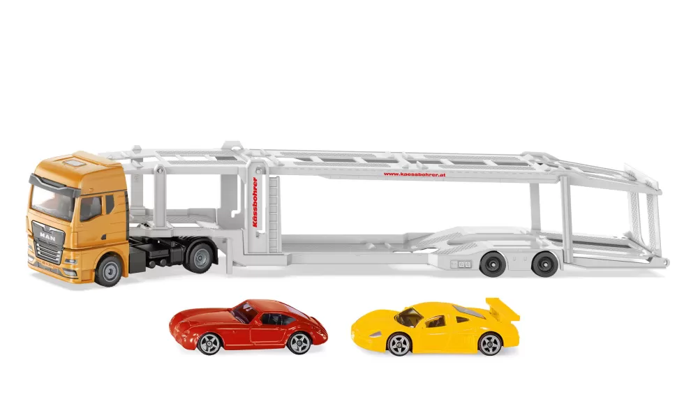 Endlich rollt der schwere Truck auf dem Autohof ein – er wird schon sehnlichst erwartet! Auf seiner Duplex-Ladefläche reihen sich die brandneuen Pkw, die jetzt von den neuen Besitzern in Augenschein genommen werden. Die schwere Zugmaschine ist im leuchtenden Gelb gehalten und trägt den MAN Schriftzug. Durch die Fenster kann man in die moderne Fahrerkabine sehen. Der große Anhänger kann im Nu an den Sattelschlepper angehängt werden. Noch schnell die Autos abladen – vorsichtig, damit keiner einen Kratzer in den Lack bekommt! Und schon ist der MAN-Transporter wieder einsatzbereit für seine nächste Fahrt. Die Zugmaschine und der Auflieger bestehen aus robustem Zinkdruckguss mit Kunststoffteilen. Der variable Auflieger lässt den Transport von PKW ebenso wie den von Landmaschinen und Baufahrzeugen zu.