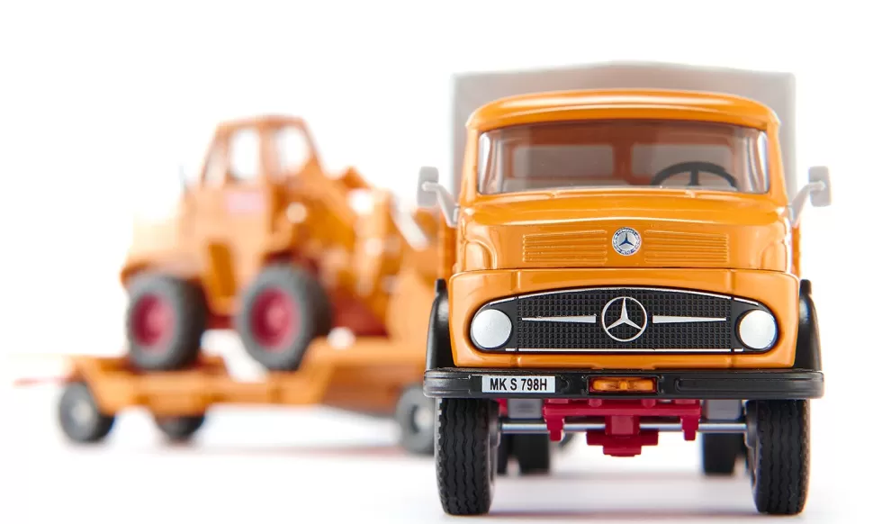 Der Mercedes-Benz Rundhauber wurde fast eine Million Mal gebaut. Eine außergewöhnlich hohe Stückzahl und eine außergewöhnlich lange Produktionszeit: von 1959 bis 1996. Der Lastwagen hat Güter, Baustoffe und Erde in der Zeit des Wirtschaftswunders bewegt und ist noch heute in der ganzen Welt unterwegs. Er war das Gesicht auf den vielen Baustellen der Bundesrepublik. Die charakteristische Haube lässt sich öffnen, die Pritsche kippen. Der 100-PS-Dieselmotor zieht einen Tieflader mit dem legendären Kramer Allrad 411. Die gelben Radlader bewegen seit den 50er- Jahren Erde, lösen Schuttgüter, transportieren Rohre oder Paletten. Das Gespann fährt im historischen Design des Bauunternehmens Bölling.