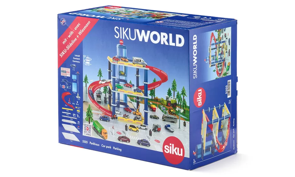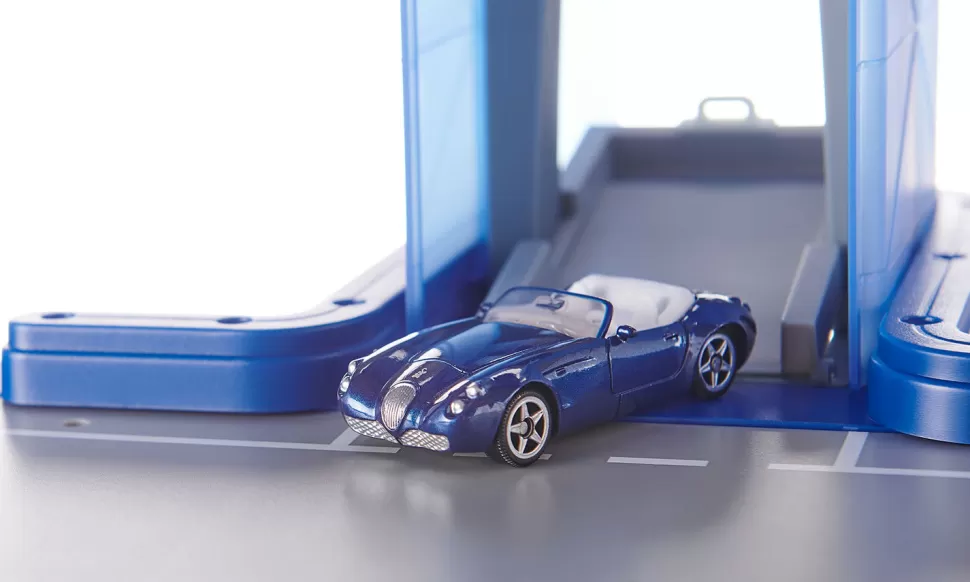 Die SIKUWORLD wächst in die Höhe. Das sich mit 3 Ebenen hoch über die SIKUWORLD ausbreitende Parkhaus setzt einen kindgerecht farbenfrohen Akzent in die siku Spielwelt im Kinderzimmer. Es lässt sich problemlos sowohl in die SIKUWORLD integrieren als auch als alleinstehendes Parkhaus bespielen. Der im Set enthaltene blaue Wiesmann Roadstar MF5 gleitet mit dem Fahrstuhl nach oben um eine der geräumigen und durchnummerierten Parkboxen zu nutzen. Die Abfahrt gestaltet sich rasant, denn das Fahrzeug fährt vom obersten Stockwerk bis hinunter zu den Ausfahrtschranken ohne Zwischenstopp. Die in die Abfahrten integrierte einzigartige siku-Slide-Line ermöglicht den hochwertigen siku-Fahrzeugen mit Gummirädern eine schwungvolle Abfahrt. Durch die Integration in das SIKUWORLD-Bausystem ist das Parkhaus jederzeit erweiterbar. Einfache und robuste Steckverbindungen ermöglichen jederzeit den schnellen Auf- und Abbau.