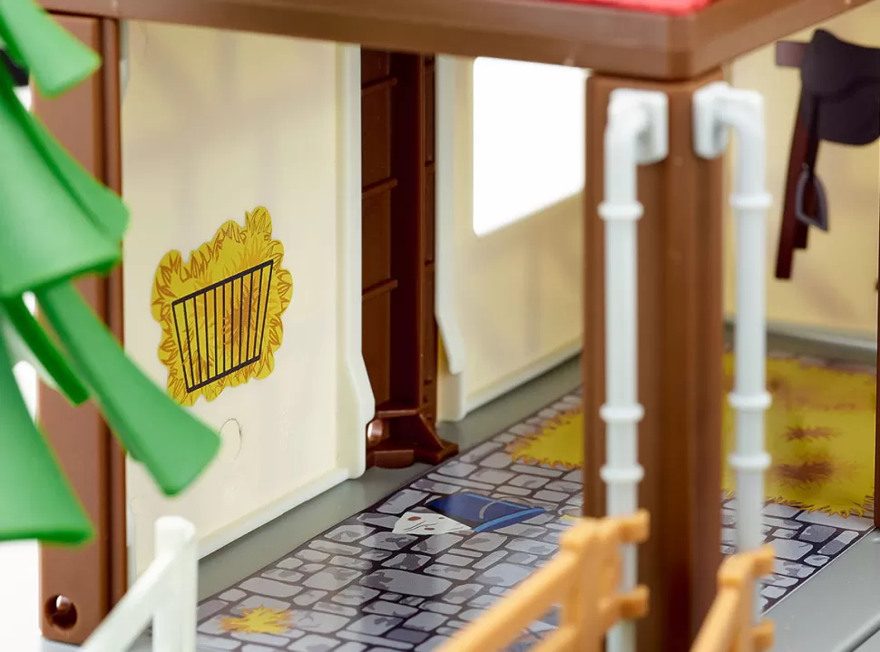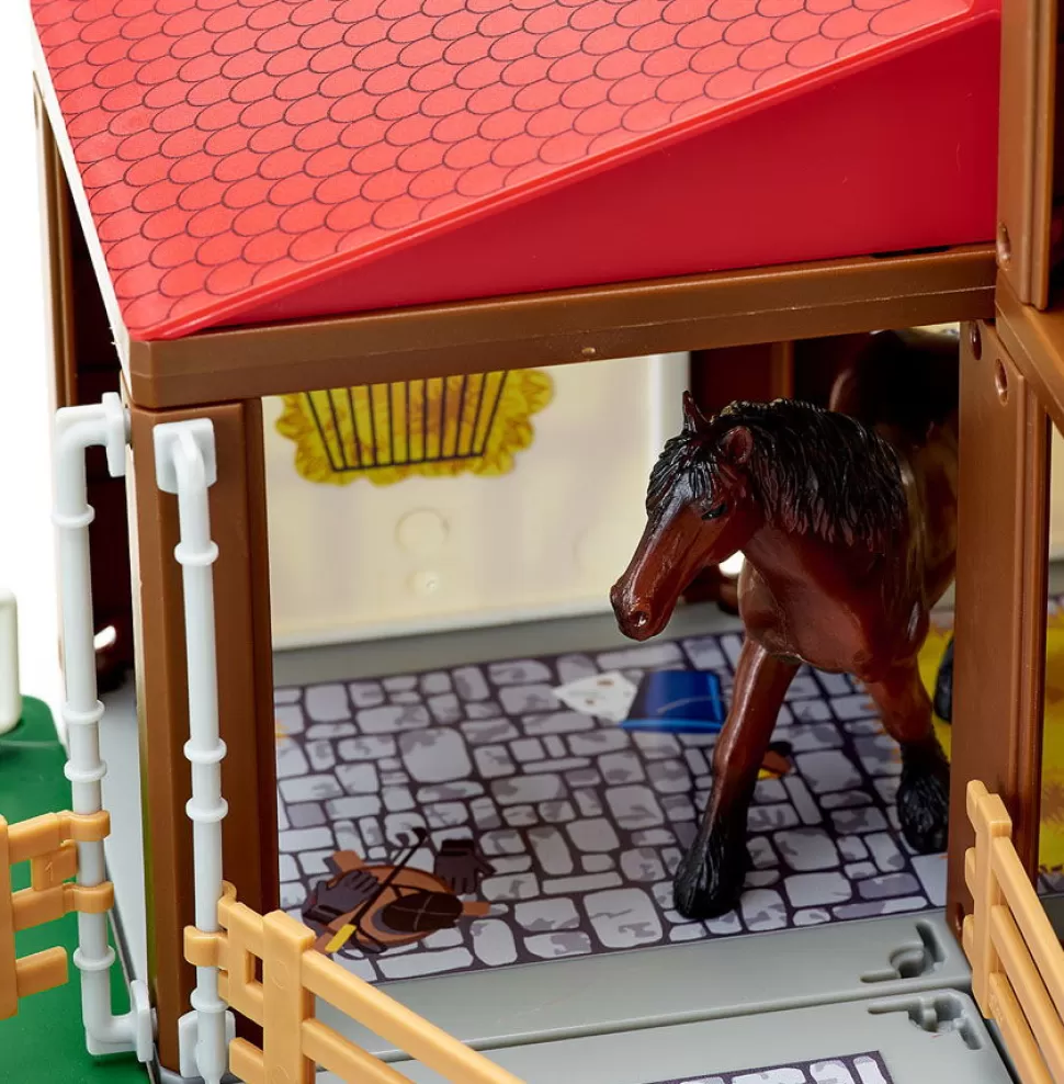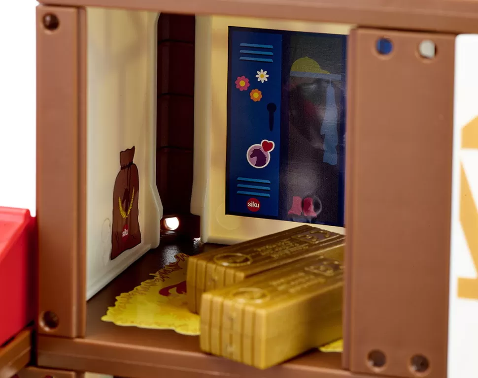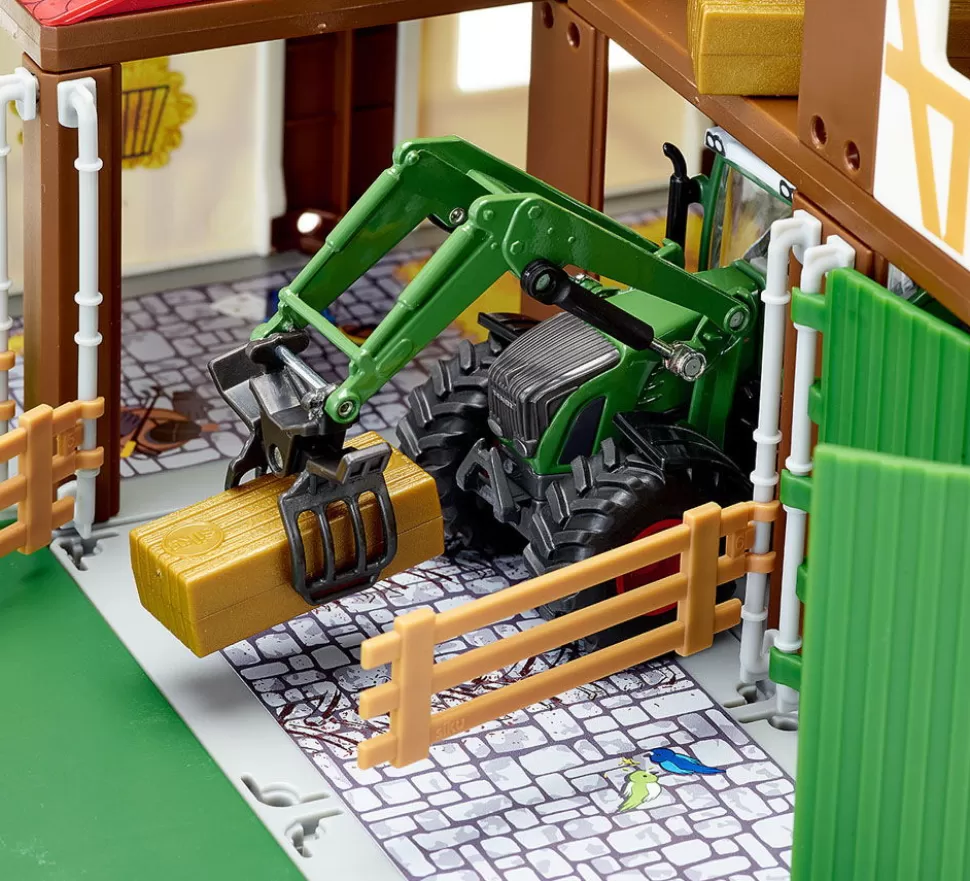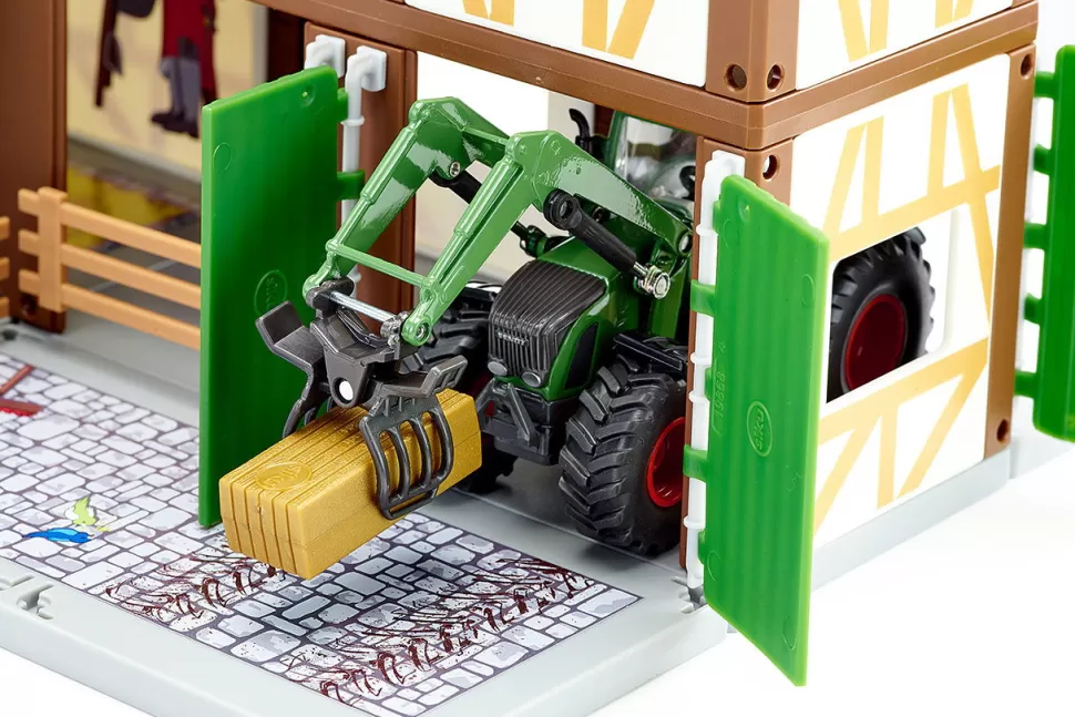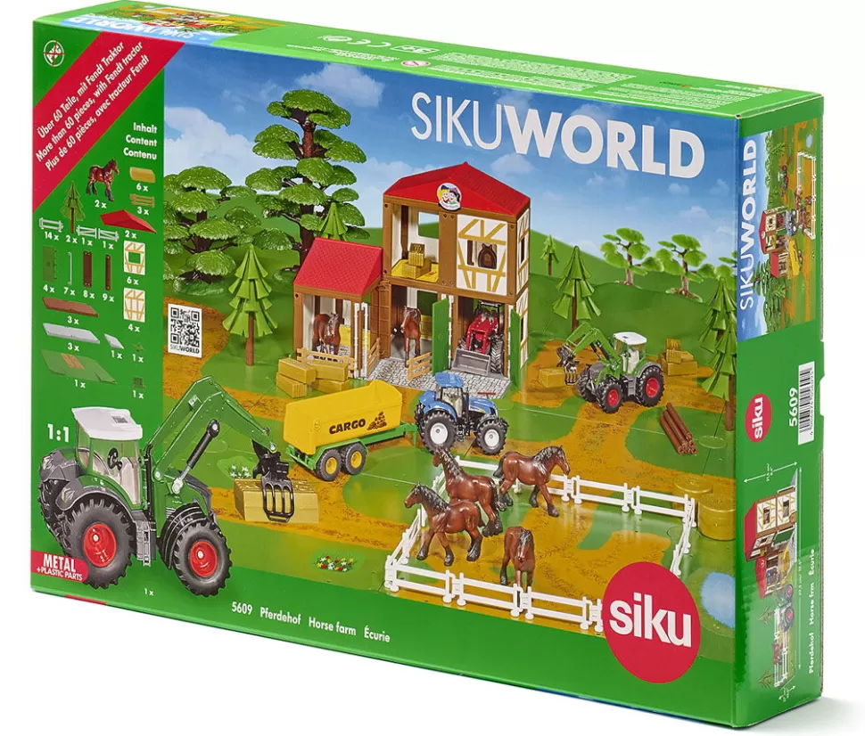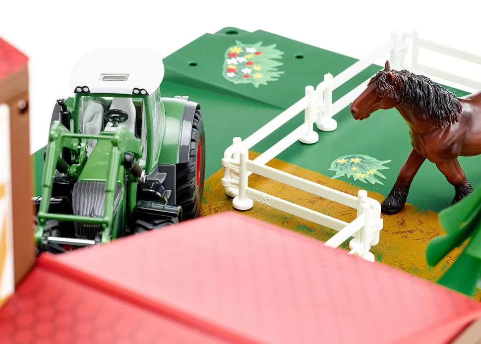 Das Set ist eine ideale Erweiterung der SIKUWORLD, bietet aber auch den Spielspaß einer eigenen Spielwelt. Der SIKUWORLD Pferdehof schafft für die Kinder Inspiration für eine neue Spielwelt mit Tieren und ländlichem Hofleben. Pferde, die auf der Koppel stehen, begrüßen mit einem lauten Wiehern die Pferdefreunde: Der nächste Ausritt steht bevor. Aber zuvor gibt es noch einiges auf dem Hof zu tun. Mit dem enthaltenen Fendt 939 Traktor und dem Ballengreifer werden die Heuballen auf dem Heuboden eingelagert. Die Gebäudeelemente im Fachwerkstil lassen sich mit dem Stecksystem intuitiv und für Kinder leicht zusammenfügen und auch nach eigenen Vorstellungen an- und umbauen. Das zweigeschossige Gebäude verfügt über eine Durchfahrt, zudem lassen sich die Pferdeställe und der Heuboden bespielen.