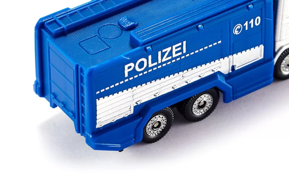 Sicherheit und OrdnungWasserwerfer sind Spezialfahrzeuge mit großen Wassertanks und beweglichen Strahlrohren, um damit Wasser mit großem Druck zu werfen. Meist werden diese von der Polizei bei Großveranstaltungen in Bereitschaft gehalten. Der siku Wasserwerfer in silber-blauer Polizeioptik fährt auf einem 3-Achs-Fahrgestell mit einem Fahrerhaus aus Metall mit einem schwenkbaren Wasserwerfer vor.