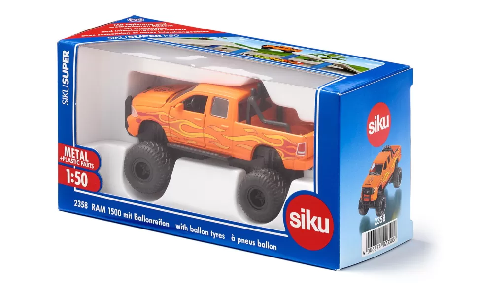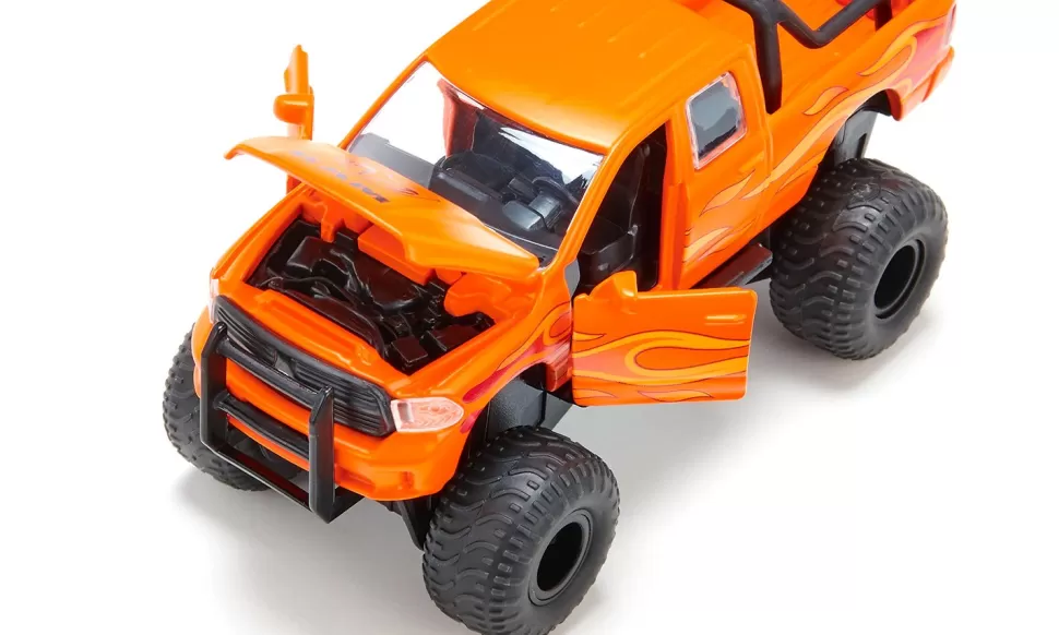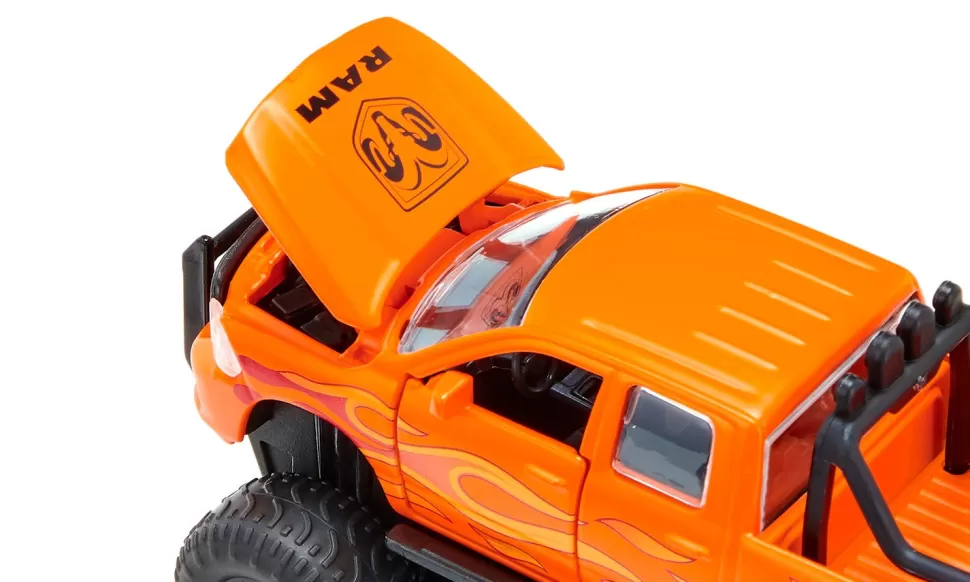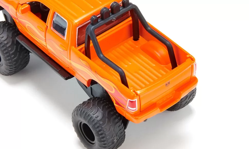 Diese beliebte US-Custom-Variante des Dodge RAM hat nicht nur Flammen auf der Karosserie, sondern auch ordentlich Druck auf dem Kessel: Mit 395 PS unter der Haube! Die Front ziert das typische Logo mit dem bulligen Kopf eines Widders, das Kraft und Stärke symbolisiert. Die bekannte Bullbar, ein massiver Frontschutzbügel, verstärkt die besonders robuste Optik. Auch auf der Ladefläche ist ein Bügel verankert, an dem eine Leuchteneinheit mit vier Strahlern montiert ist. Die Karosserie dieses siku-Modells ist aus Metall, Motorhaube, Türen und Heckklappe lassen sich öffnen. Jede seiner Achsen ist einzeln gefedert, die Räder sind wechselbar. Als höhergelegte Custom-Variante in knalligem Orange mit besonders dicken und breiten Ballonreifen und Flammenbedruckung auf beiden Seiten ist der RAM 1500 eine beeindruckende Erscheinung, die man auf amerikanischen Highways durchaus öfter sieht.