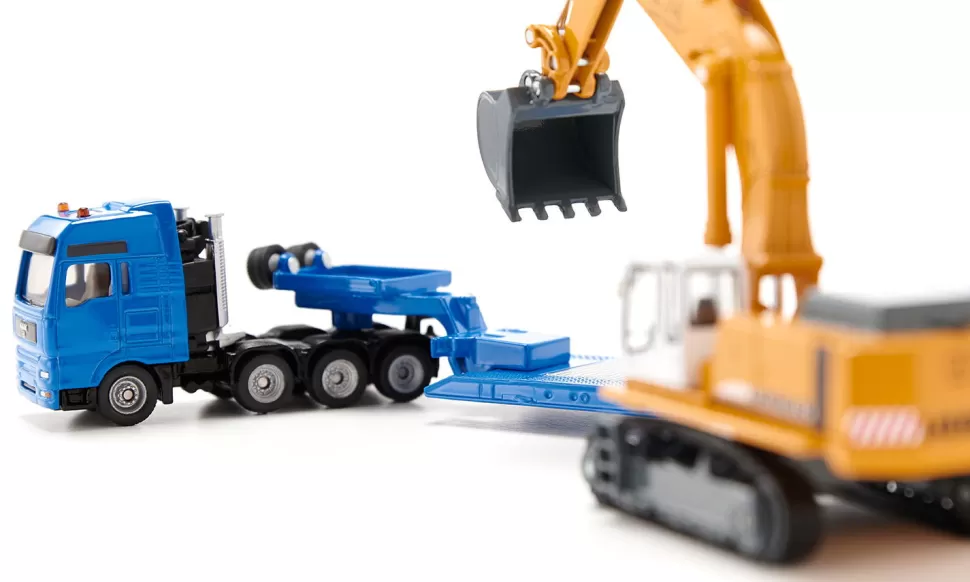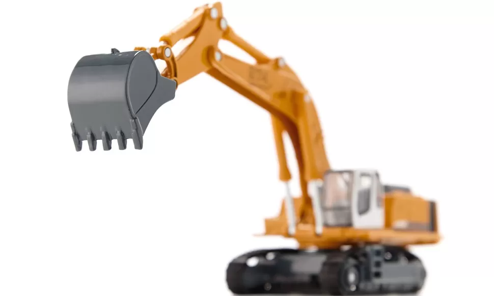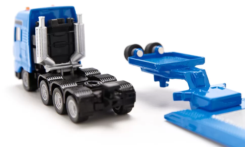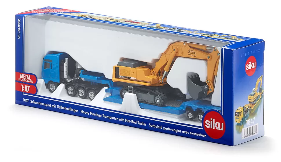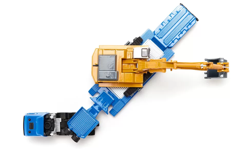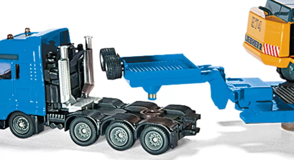 Der MAN TG-A in seiner beeindruckensten Form als 4-achsige Schwertransportzugmaschine im Maßstab 1:87. Design-Felgen mit gummierten Laufflächen. Sehr detaillierte Darstellung der Außenaggregate und der Auspuffrohre hinter der Kabine. Mit Sattelkupplung. Aufgesattelt wird ein 3-achs-Tiefbettauflieger mit Schwanenhals. Das Tiefbett ist mit einer für Kinderhände gut bedienbaren Mechanik ausgestattet, um es leicht vom Schwanenhals trennen zu können. Dies ermöglicht das realistische Nachspielen des originalen Beladungsvorgangs. Als Ladung dient ein Großbagger der Marke Liebherr mit Tieflöffel.