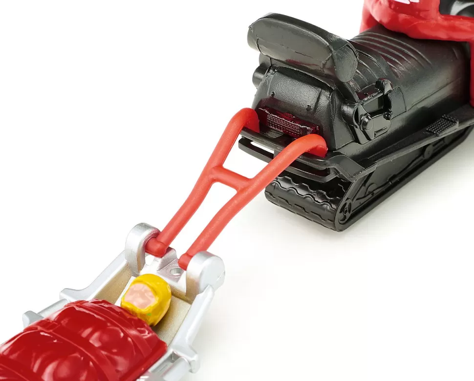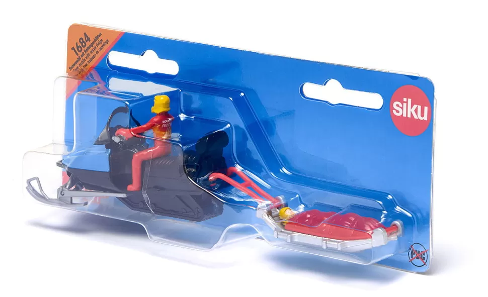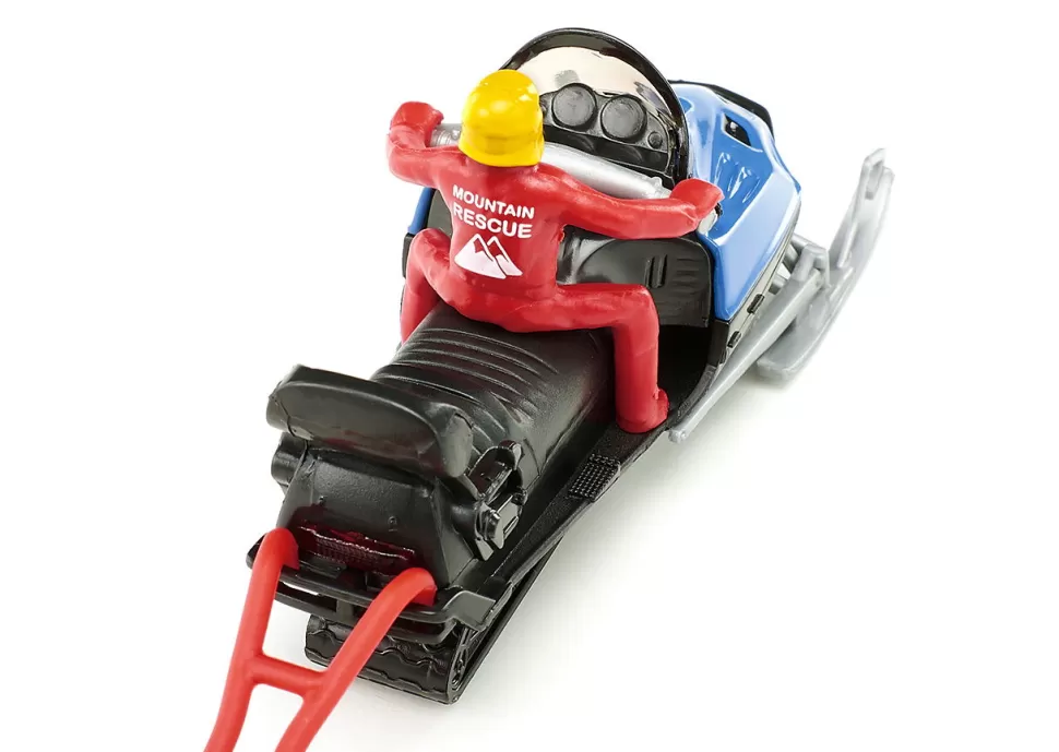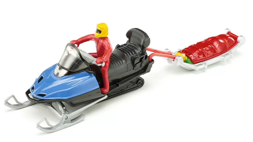 Notruf bei der Bergwacht: Ein Touren-Skifahrer hat sich im Tiefschnee verletzt und muss geborgen werden. Das Snowmobil mit dem Rettungsschlitten steht startbereit, die Retter sausen in einer Schneewolke los, Schnee spritzt auf. Die Unglücksstelle ist schnell geortet, der Verunglückte wird geborgen, in den Rettungsschlitten gelegt und warm verpackt in die Rettungsstation gefahren. Die Szene lässt sich mit den zwei Figuren nachspielen und die Kinder werden im Kinderzimmer zu Rettern. Mit dem SIKU Rettungshubschrauber (2539), dem neuen SIKU Transporthubschrauber (2527) und dem SIKU Rettungswagen (2108) sind die jungen Retter bestens für den nächsten Einsatz ausgerüstet. Das Snowmobil mit Rettungsschlitten ist zudem die ideale Ergänzung zum SIKU Pistenbully (1037) und dem SIKU Snowmobil (0860).