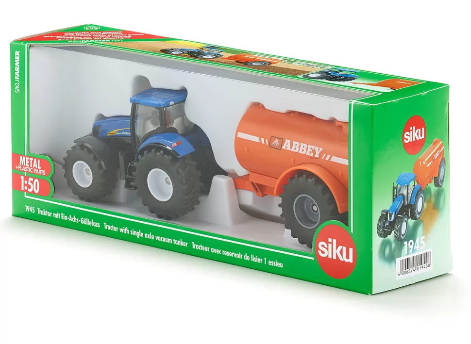 New Holland Traktor mit einem Fasswagen der Marke Abbey aus Irland. Diese farblich sehr ansprechende Kombination aus Metall und Kunststoff ergänzt die Serie der im Maßstab 1:50 gehaltenen landwirtschaftlichen Modelle um das Thema Ausbringung von Dünger. Für erhöhten Spielwert ist der Deckel des Fasswagens klappbar, damit der Tank mit Wasser befüllt werden kann. Befindet sich Wasser im Tank, kann dieses durch den am Heck angebrachte Stopfen wieder abgelassen werden.