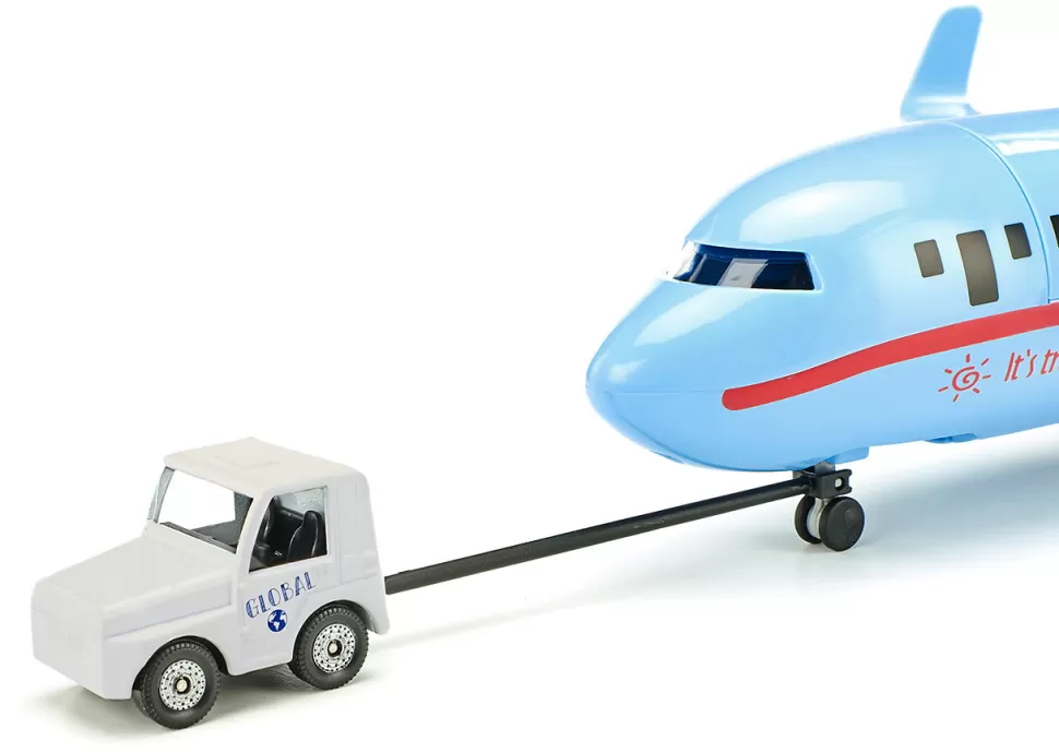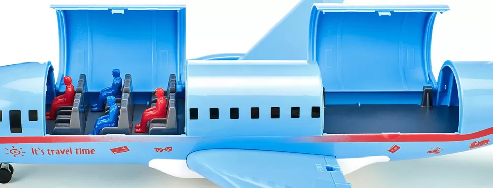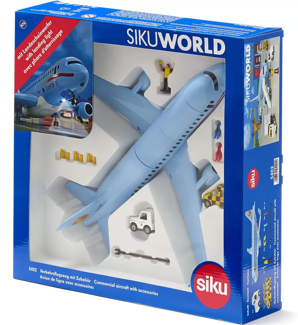 Das große SIKUWORLD Verkehrsflugzeug (38,5 cm) mit den zwei mächtigenTriebwerken steht zum Einsteigen bereit. Doch wer sitzt wo? Das Kabinenpersonal kann einfach die vordere Klappe im Dach anheben und die vier Passagiere ihre Plätzen zuweisen. In der hinteren Klappe ist Platz im Laderaum für das Lieblingsauto, das mit in den Urlaub genommen werden kann. Voller Schub, der Flieger wird schneller und schneller, hebt ab und das Fahrwerk kann eingeklappt werden. Bereit machen zum Landeanflug: Fahrwerk ausklappen und den Landescheinwerfer anmachen. Die LED geht nach zehnMinuten Betriebszeit automatisch aus. Das Flugzeug ist gelandet. Das Follow-me-Fahrzeug begleitet das Flugzeug zur Parkposition.Der Flugzeugschlepper mit der Schleppstange stehen schon für den nächsten Abflug bereit. Die ideale Erweiterung zum Verkehrsflugzeug ist das neue Flughafen Set (Artikelnummer 6312).